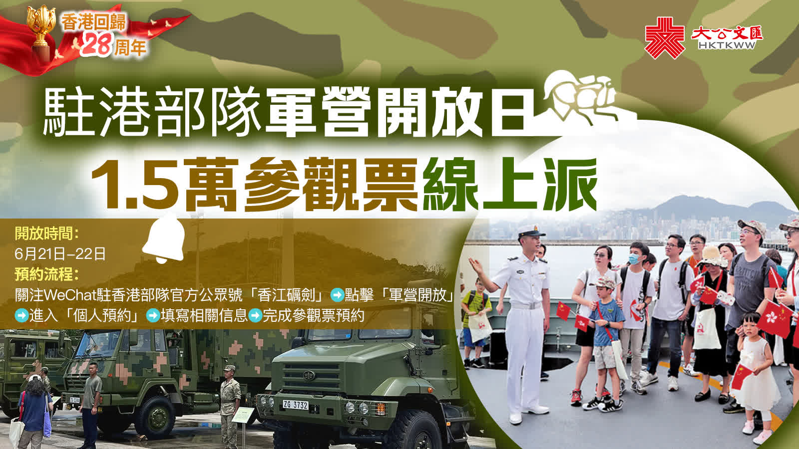 (大公報記者 龔學鳴)為慶祝香港回歸祖國28周年,中國人民解放軍駐香港部隊「七一」軍營開放活動本周末(21日、22日)舉行,1.5萬張參觀票今日將通過線上發放。