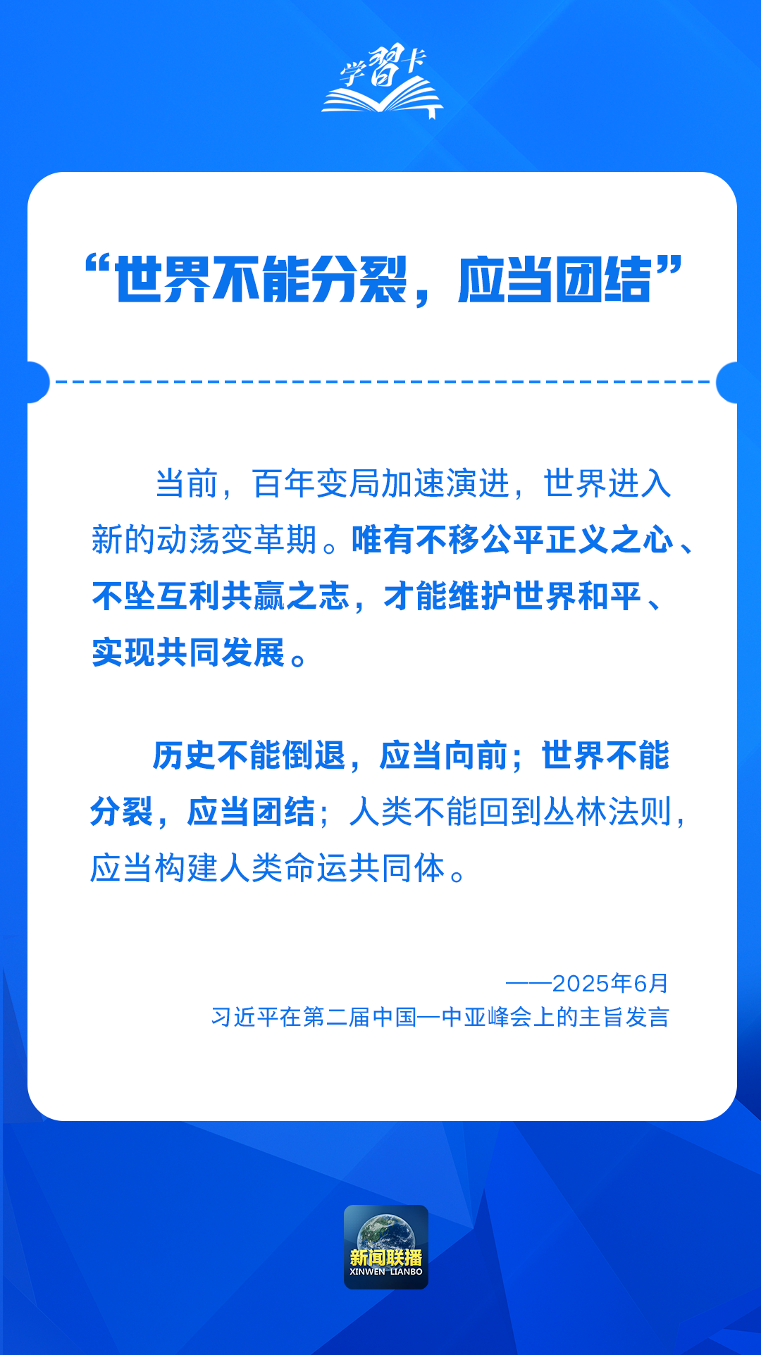 習近平表示,中國中亞合作根植於兩千多年的友好往來,鞏固於建交30多年的團結互信,發展於新時代以來的開放共贏。中方願同各方一道努力,弘揚「中國—中亞精神」,錨定命運共同體目標,推動中國中亞合作不斷取得新的成就。
