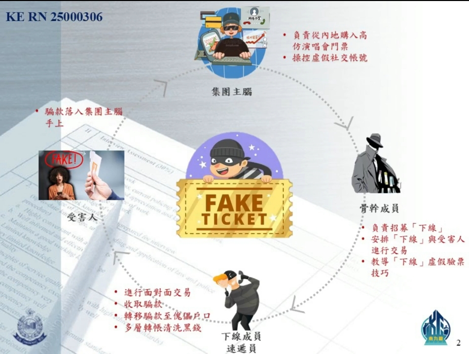 警方稱,詐騙集團分工仔細,集團首腦會利用多個社交平台發布廣告及帖文,及上載門票並遮蓋部分正面,令買家難以分辨真偽。人員亦發現騙徒透過跨境工廠大量印製假門票,安排到香港出售。集團骨幹成員則負責招募「假飛派遞員」充當下線,並安排買家與下線面對面交收。當騙徒與買家交收時,下線人員除了會分享虛假的驗票技巧外,亦會提供虛假二維碼或偽造的訂單電子截圖,當中會顯示座位編號及偽造的官方購買紀錄。另外,警方調查發現部分集團成員的個人戶口被用作洗黑錢。