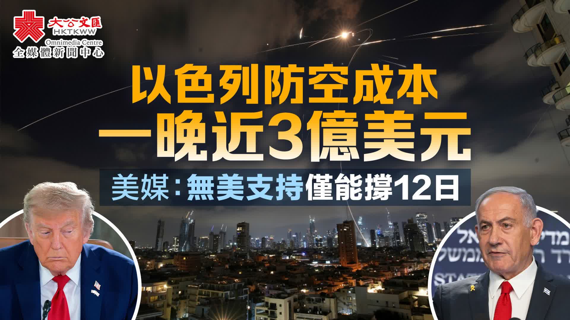 大公文匯全媒體報道,美國《華盛頓郵報》當地時間6月17日稱,根據以色列財經報紙The Marker的估算,與伊朗爆發衝突後,以色列每晚的防禦成本高達2.85億美元(約合人民幣22.37億港幣),以色列防空系統或僅能再撐12天。該報道提到,根據專業人士的評估,在沒有美國補給、伊朗維持現有攻擊強度的情況下,以色列的防禦系統,僅能維持10至12天。