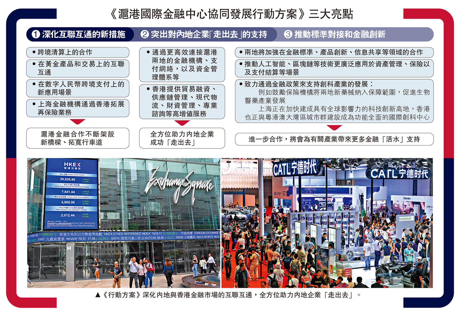 《行動方案》涵蓋六方面共38項措施,包括深化內地與香港金融市場的互聯互通、促進兩地資本市場的聯繫與合作、支持符合條件的上海企業在香港上市融資,以及加強兩地在大宗商品交易、再保險業務、綠色金融、金融科技等領域的合作,進一步發揮兩地在金融開放、金融發展及風險防範方面的優勢,並加強跨境金融及離岸金融的合作,推動兩地國際金融中心的協同發展。