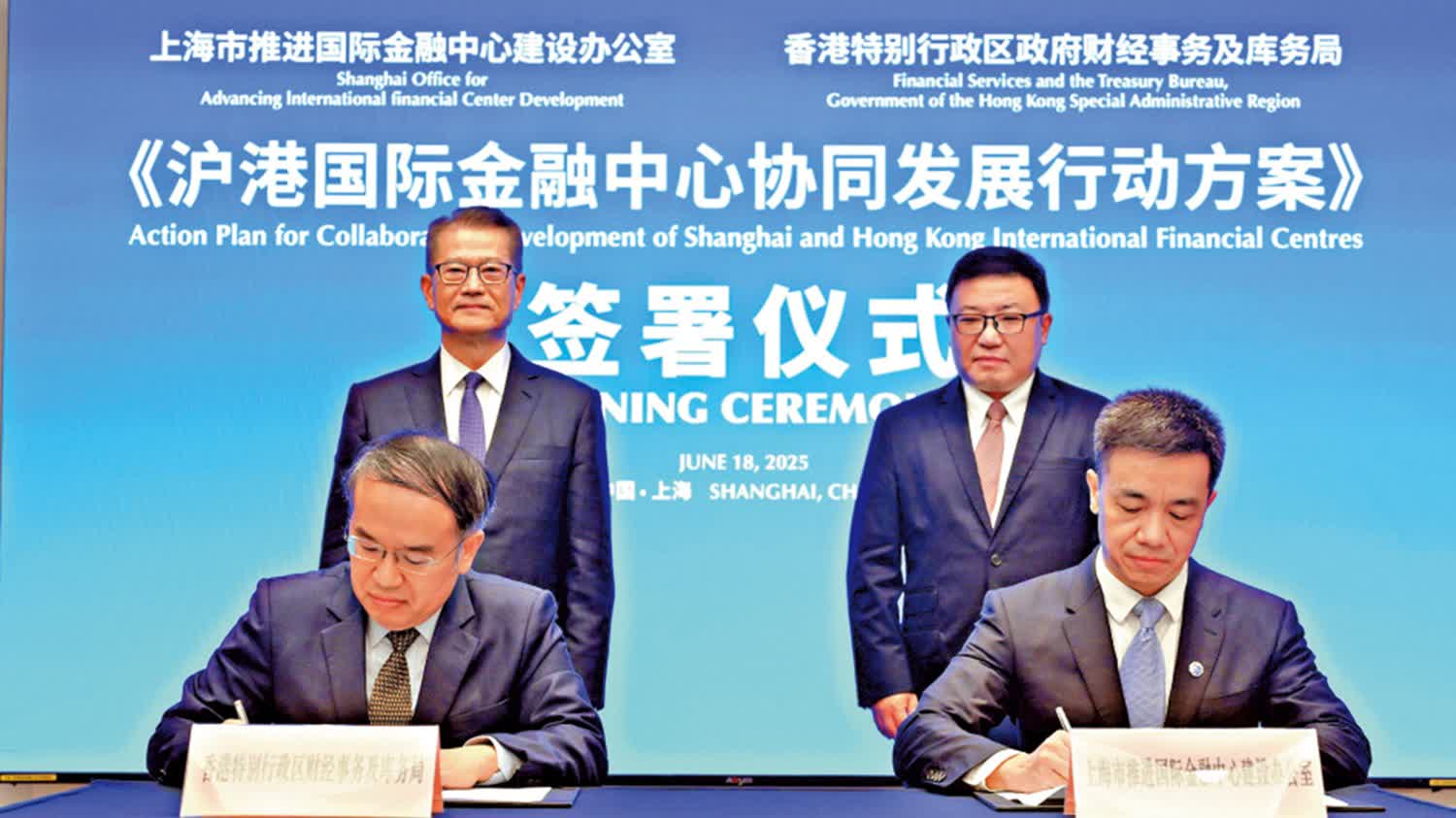 (大公報記者 倪巍晨上海報道)「2025陸家嘴論壇」昨日在滬開幕,香港特區政府財庫局局長許正宇、上海市委金融委員會辦公室常務副主任周小全代表兩地於論壇期間簽署《滬港國際金融中心協同發展行動方案》。《行動方案》涉六方面共38條措施,旨在貫徹落實中央有關鞏固提升香港國金中心地位,增強上海國金中心競爭力和影響力的要求。