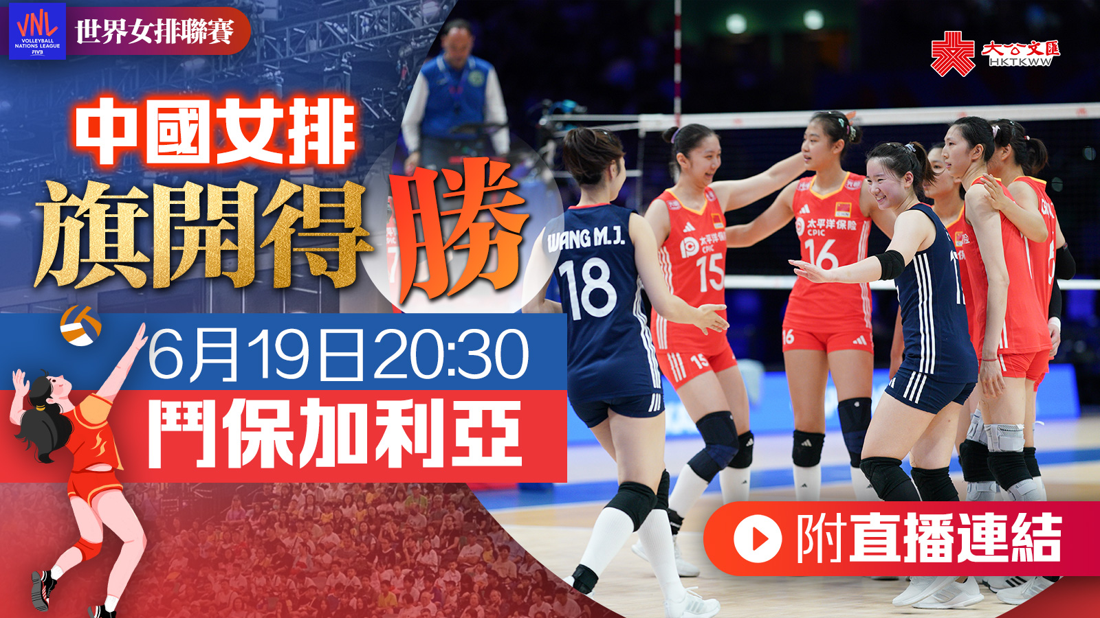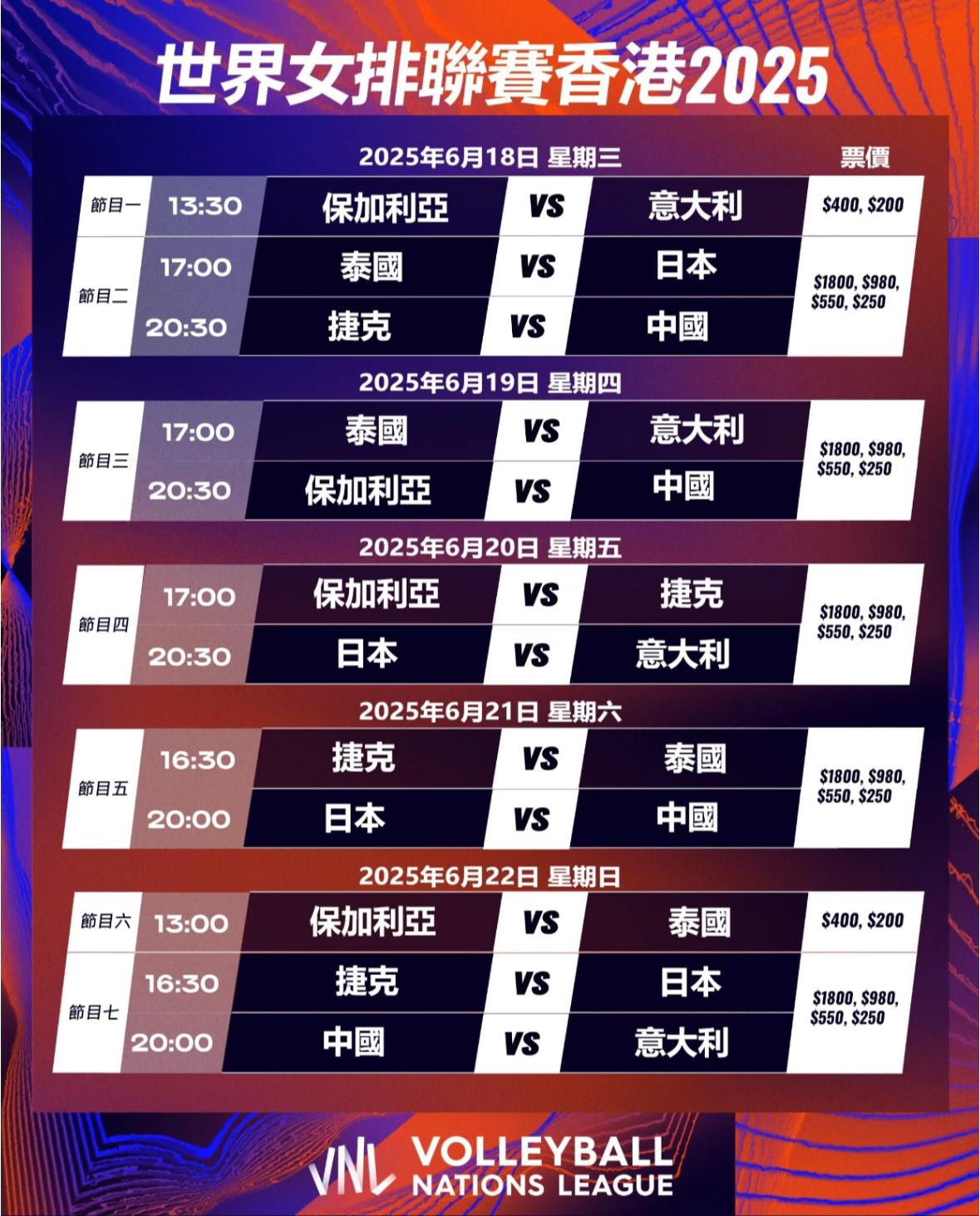 世界女排聯賽香港站6月19日賽程: