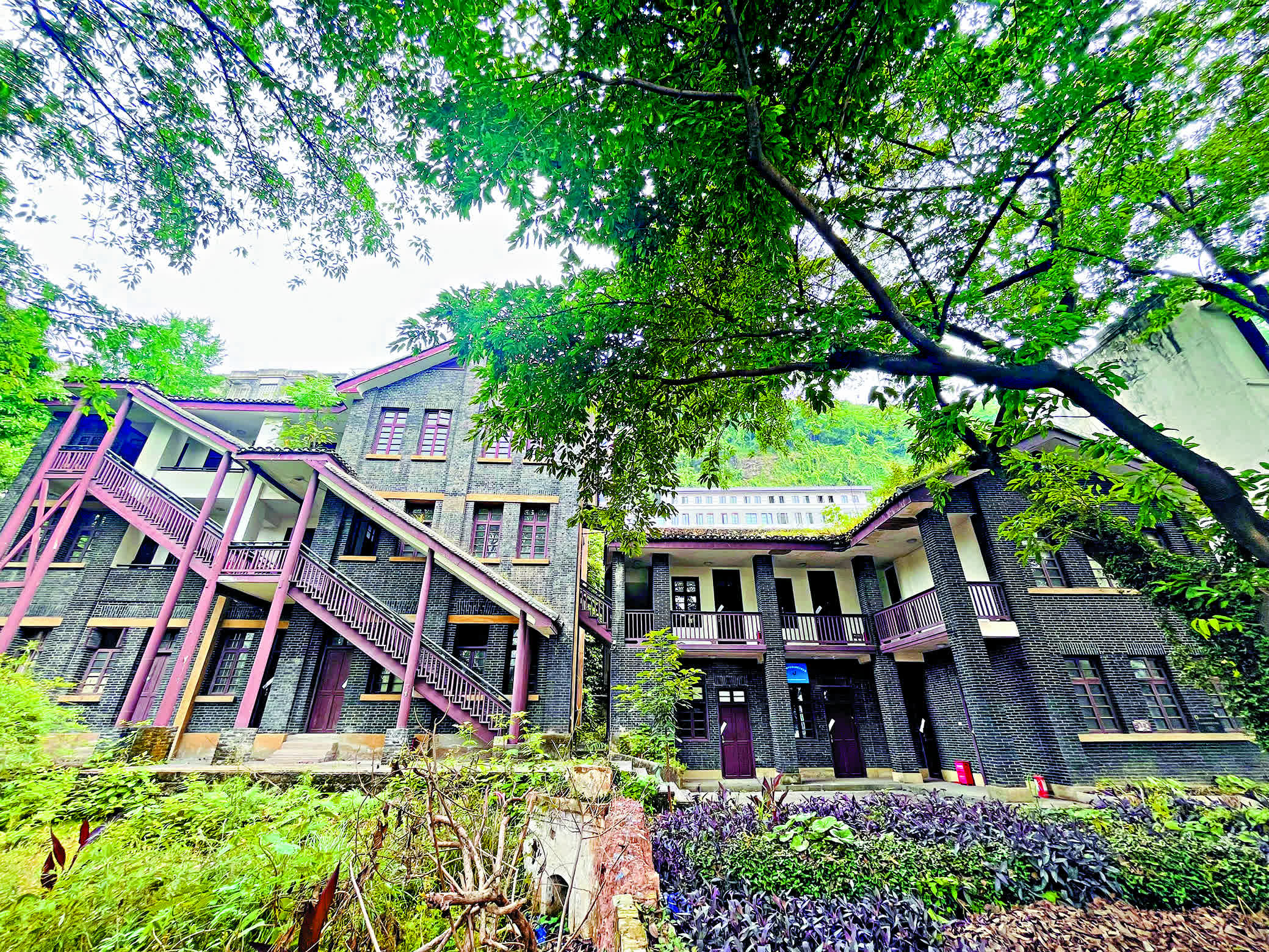 從李子壩正街邁上十幾級長滿青苔的台階,推開一扇鐵門,濕土氣息撲面而來,濃蔭蔽日的老黃葛樹拱衛着兩棟青磚壘就的建築,一塊鐫刻着「重慶市文物保護單位」的石牌在建築上無聲矗立。