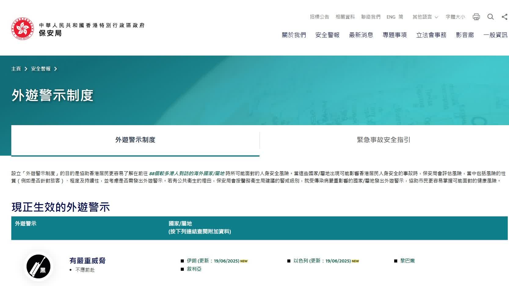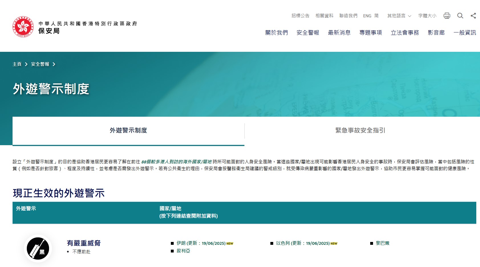 政府發言人表示,黑色外遊警示級別表示有嚴重威脅,由於以色列和伊朗的安全形勢極不明朗,特區政府呼籲市民不應前赴當地。身在以色列或伊朗的港人要注意人身安全,並應盡快撤離或轉移至相對安全區域。保安局會繼續密切留意當地局勢,如有進一步消息,會透過媒體、保安局流動應用程式及外遊警示網頁發布當地最新情況。