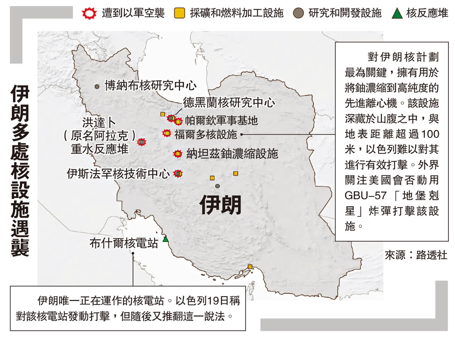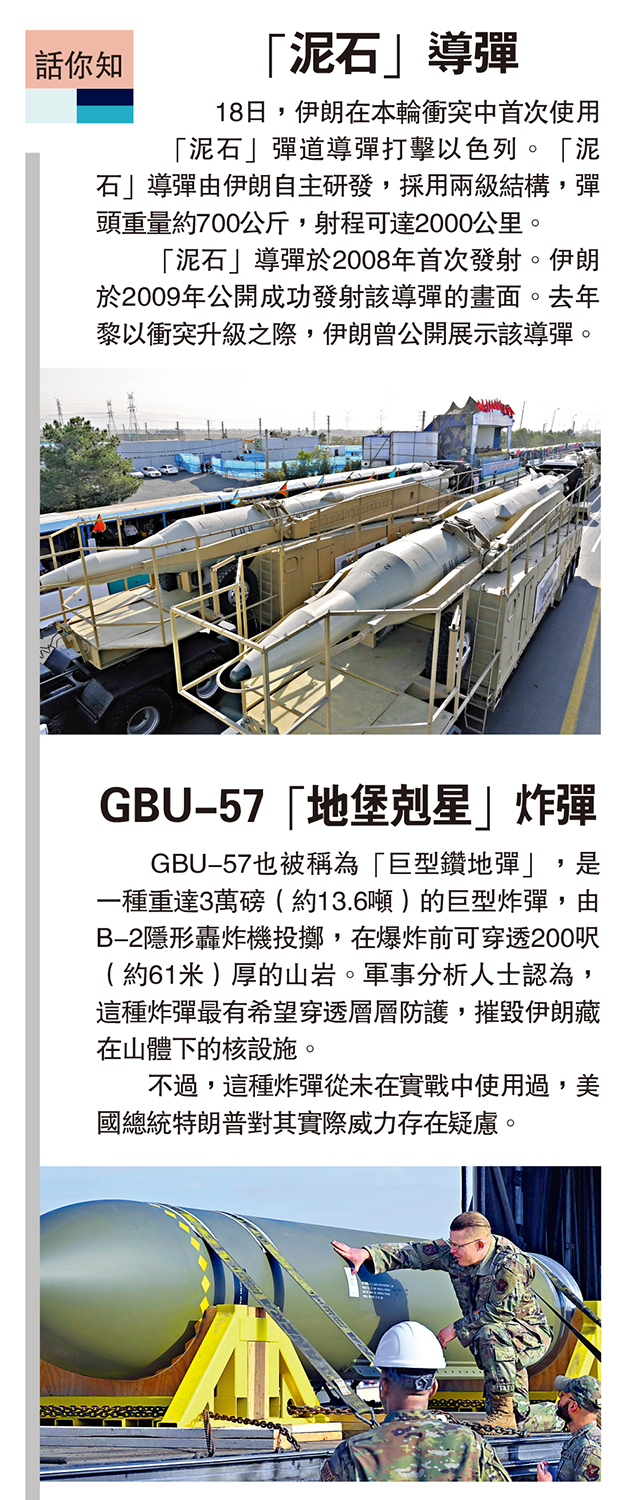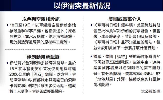 大公報綜合報道,以色列與伊朗19日繼續互相發動空襲,以色列轟炸伊朗多處核設施,伊朗則首次動用射程可達2000公里的「泥石」彈道導彈。美國《華爾街日報》爆料稱,美國總統特朗普已批准美軍對伊朗的打擊計劃,但暫未下達最終命令。有分析認為,美軍或動用GBU-57「地堡剋星」炸彈,打擊對伊朗核計劃最為關鍵的福爾多核設施。特朗普19日回應說:「《華爾街日報》根本不知道我對伊朗的想法。」本港時間20日凌晨,特朗普又發聲明稱,將在未來兩周內決定是否採取行動。