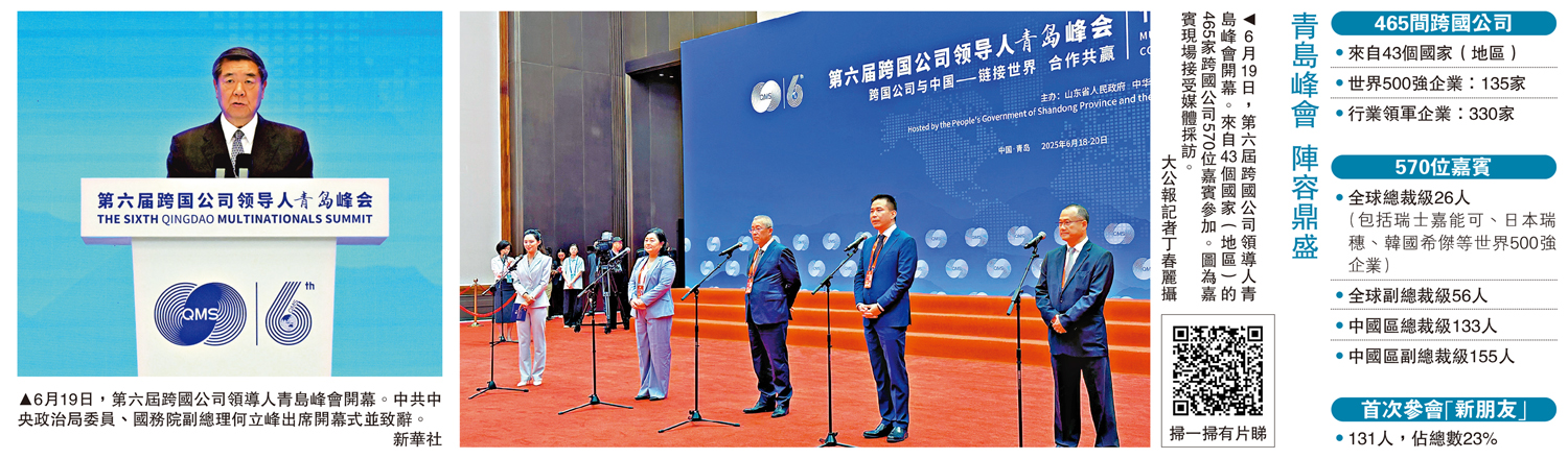 (大公報記者 丁春麗、楊奕霞青島報道)6月19日,由商務部和山東省政府共同主辦的第六屆跨國公司領導人青島峰會(以下簡稱「青島峰會」)開幕,吸引了來自43個國家(地區)的465家跨國公司570位嘉賓。與會嘉賓紛紛表示,將加碼投資中國,繼續深耕中國市場,共享中國機遇。