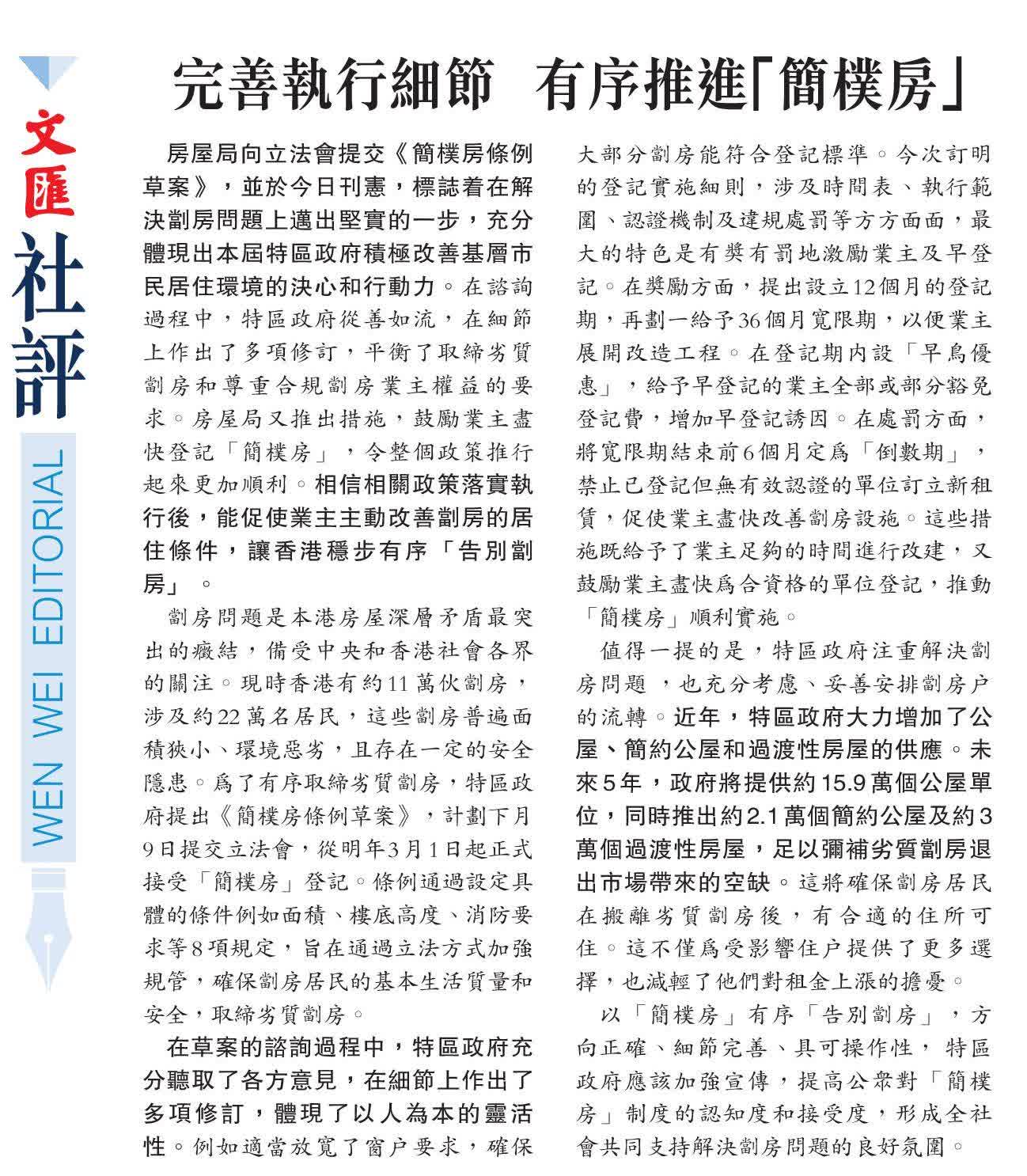 劏房問題是本港房屋深層矛盾最突出的癥結,備受中央和香港社會各界的關注。現時香港有約11萬伙劏房,涉及約22萬名居民,這些劏房普遍面積狹小、環境惡劣,且存在一定的安全隱患。為了有序取締劣質劏房,特區政府提出《簡樸房條例草案》,計劃下月9日提交立法會,從明年3月1日起正式接受「簡樸房」登記。條例通過設定具體的條件例如面積、樓底高度、消防要求等8項規定,旨在通過立法方式加強規管,確保劏房居民的基本生活質量和安全,取締劣質劏房。