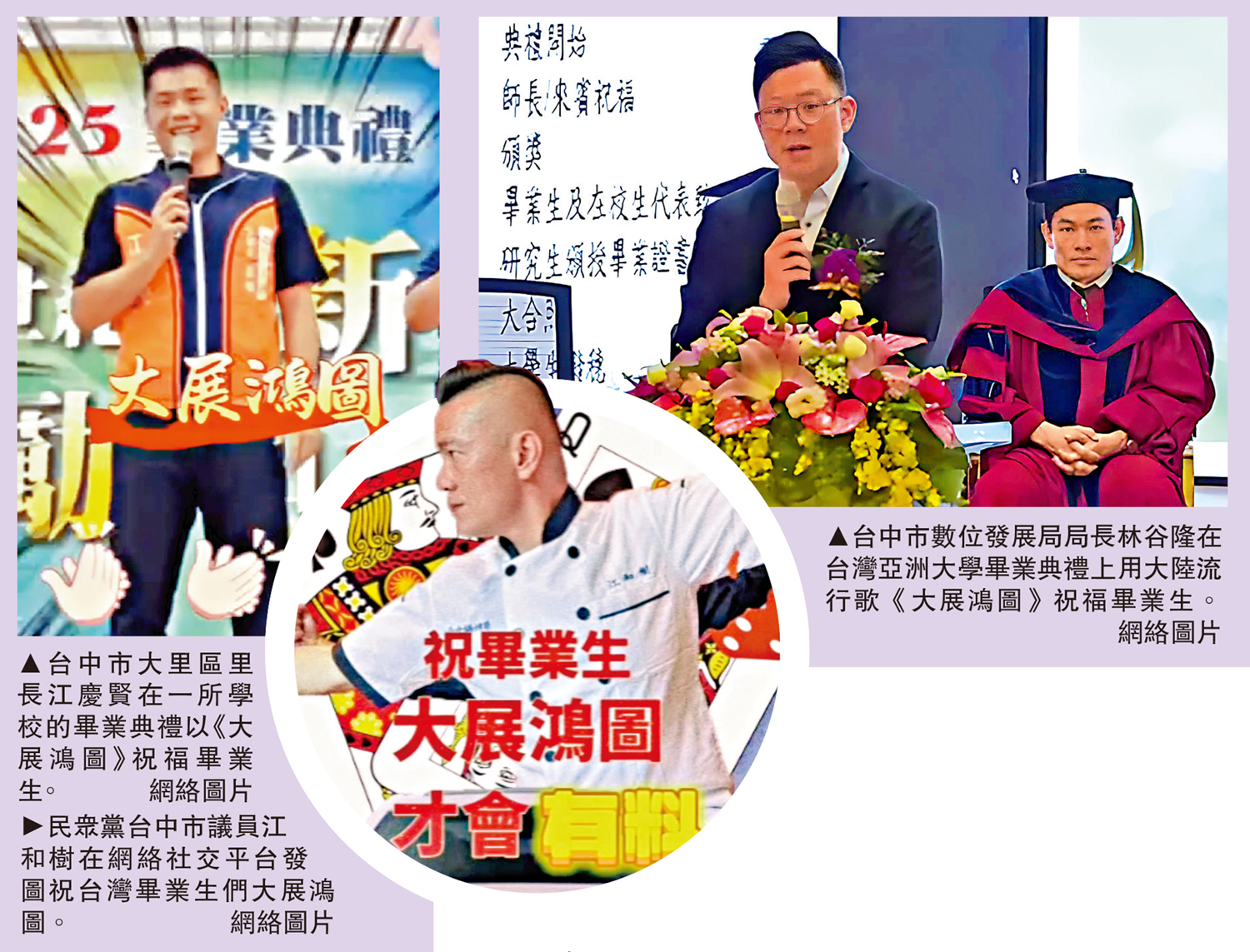 島內學者何溢誠向《大公報》表示,林谷隆在亞洲大學畢業典禮唱大陸流行歌,學生齊呼「大展鴻圖」的互動,本是創意與溫情的結合。綠營卻將其扭曲為「失莊重」,這種對青春活力的壓制,只會讓年輕一代更厭惡泛政治化。「大展鴻圖」本是送給應屆畢業生最樸素的祝福,如今卻被綠營捏造成政治枷鎖。當民進黨連大學畢業生唱什麼歌都要扣上紅帽子時,暴露的不僅是其「台獨」意識形態作祟,更是對台灣民主自由的破壞。