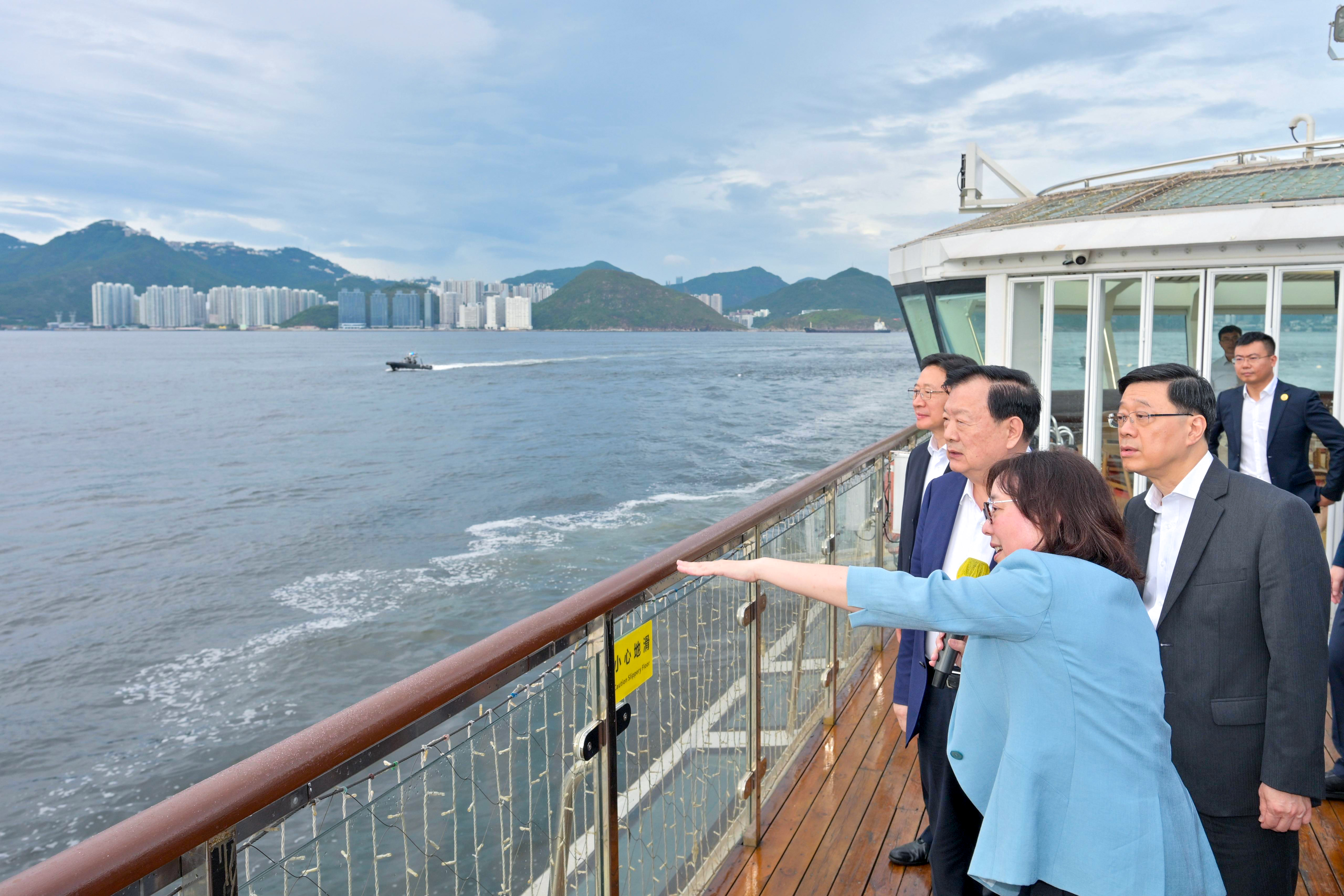 其後,夏寶龍主任由李家超、黃偉綸和發展局局長甯漢豪陪同,乘船前往南丫島,考察前南丫石礦場用地的發展計劃,並沿途聽取重點旅遊開發項目。