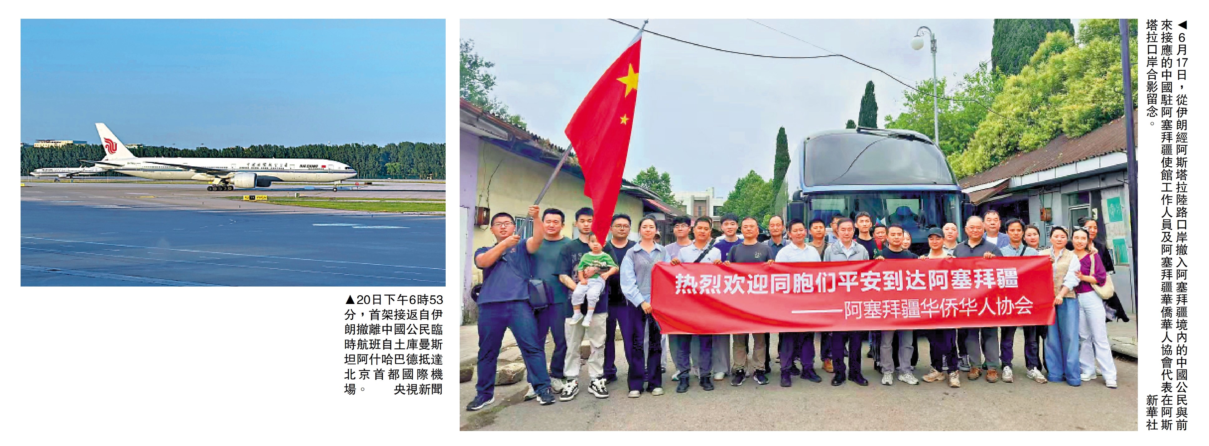 中國駐阿塞拜疆大使魯梅此前介紹,在中國外交部和駐伊朗使館組織協調下,以及相關鄰近國家積極協助支持下,已有七百多名中國公民自伊朗轉移至阿塞拜疆、土庫曼斯坦等周邊國家,還有千多人正在轉移撤離途中。魯梅表示,從伊朗入境阿塞拜疆中方人員中,包括在伊朗的中資機構人員、留學生和務工人員,其中也包括香港同胞,還有10個月大的嬰兒和2歲的孩子,他們已獲妥善安置。