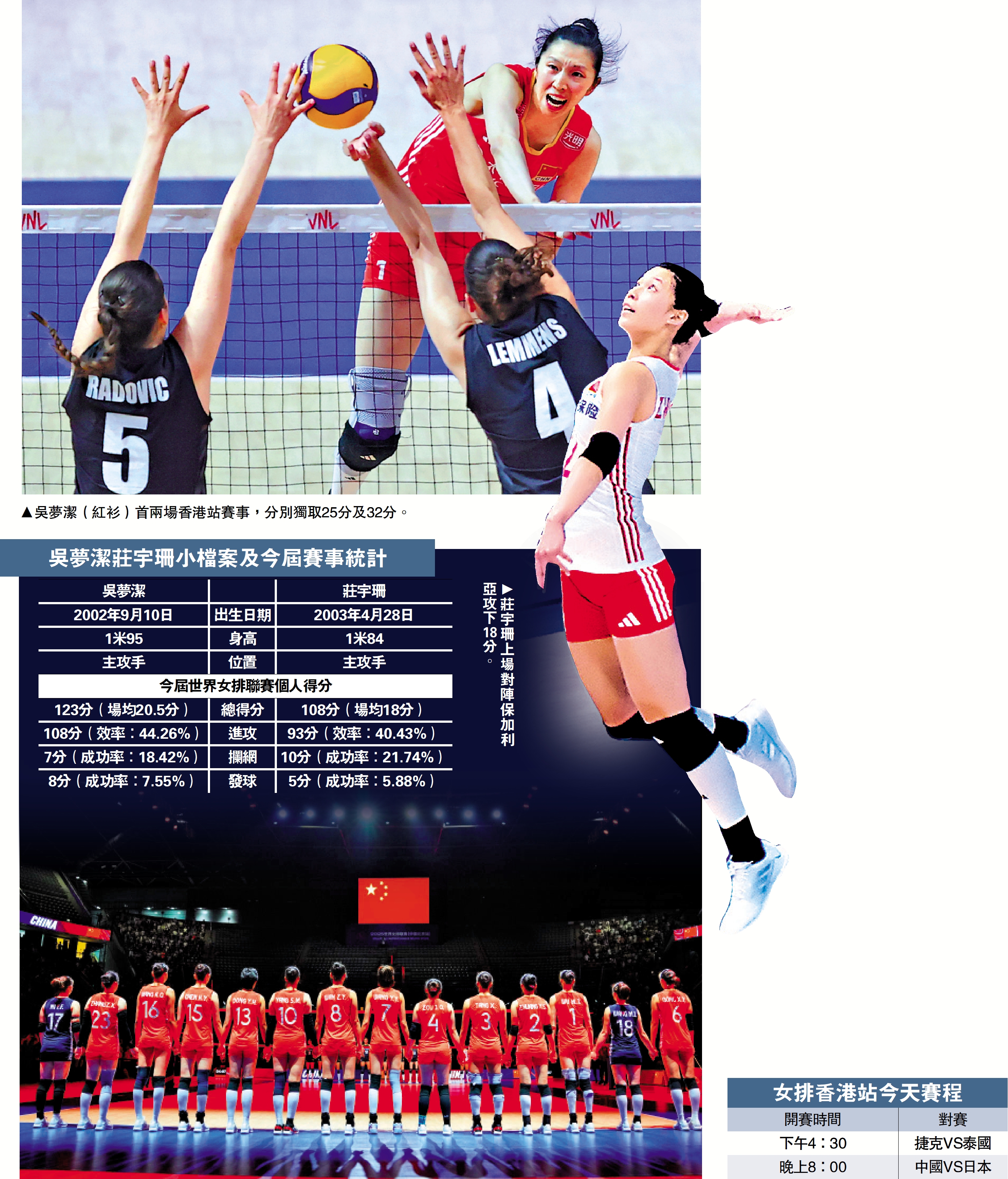 中國女排在香港站首戰以3:1擊敗捷克隊,次戰以3:2險勝保加利亞隊,展現出年輕陣容的韌性與潛力。主攻手吳夢潔首戰獨得25分,次戰更攻下32分,另一主攻手莊宇珊以及替補上場的唐欣次戰也分別貢獻18分和11分,年輕隊員在原有主攻重心李瑩盈仍有傷在身之下,展現出潛力。今晚對陣以快速多變的戰術和頑強的防守著稱的日本女排,國家隊將迎來不少考驗。