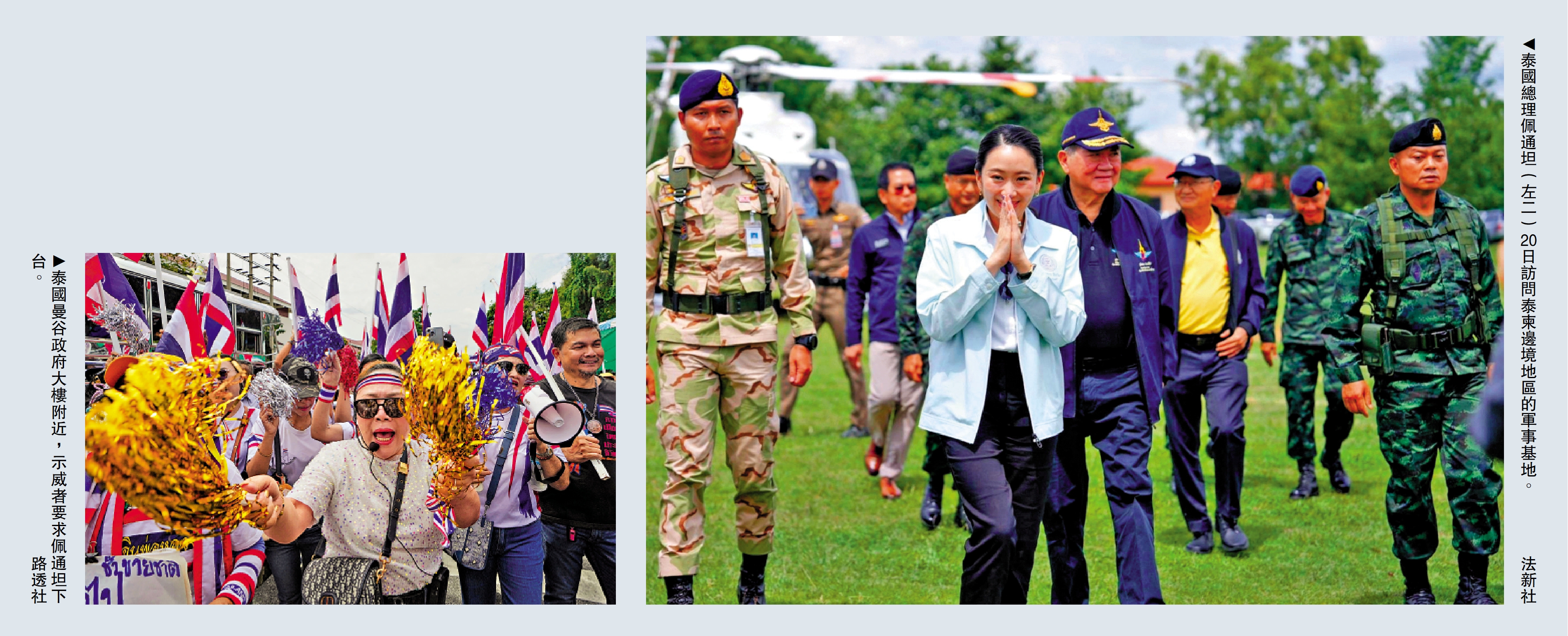 大公報綜合報道,泰國總理佩通坦的「電話門」事件持續發酵。佩通坦與柬埔寨參議院主席洪森通電話的對話錄音日前外洩,裏面有貶損軍方的內容,引發政壇動盪。佩通坦所屬為泰黨的政治盟友、第二大黨自豪泰黨已宣布退出執政聯盟。佩通坦隨後就通話事件致歉,20日前往泰柬邊境訪問陸軍基地,以化解政治危機。分析指出,失去重要的政治盟友後,執政聯盟目前在眾議院的政治力量被大幅削弱,岌岌可危。
