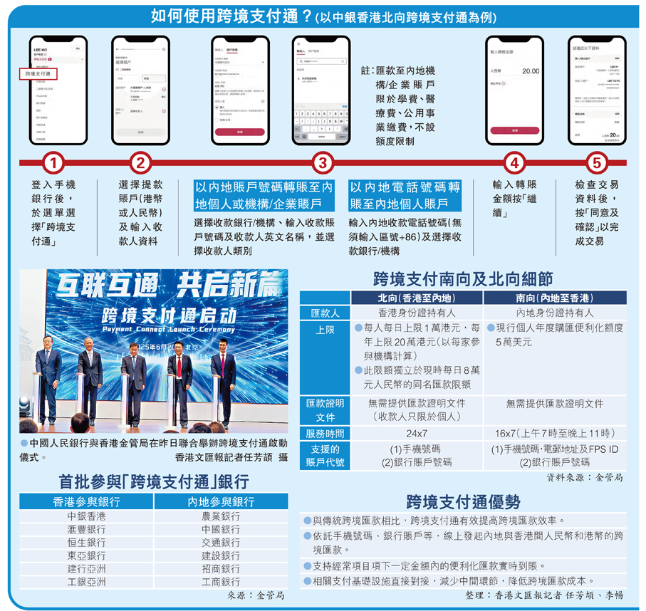 香港文匯報A3版要聞《跨境支付通明日啟動 轉數快5步匯款內地》報道,香港與內地居民即將迎來跨境支付新時代,從周日(22日)起,跨境支付通將於周日啟動,首階段雙邊將有各6間銀行參與,其中港人使用轉數快(FPS)只需5個步驟即可匯款至內地。點擊閲讀詳情>>
