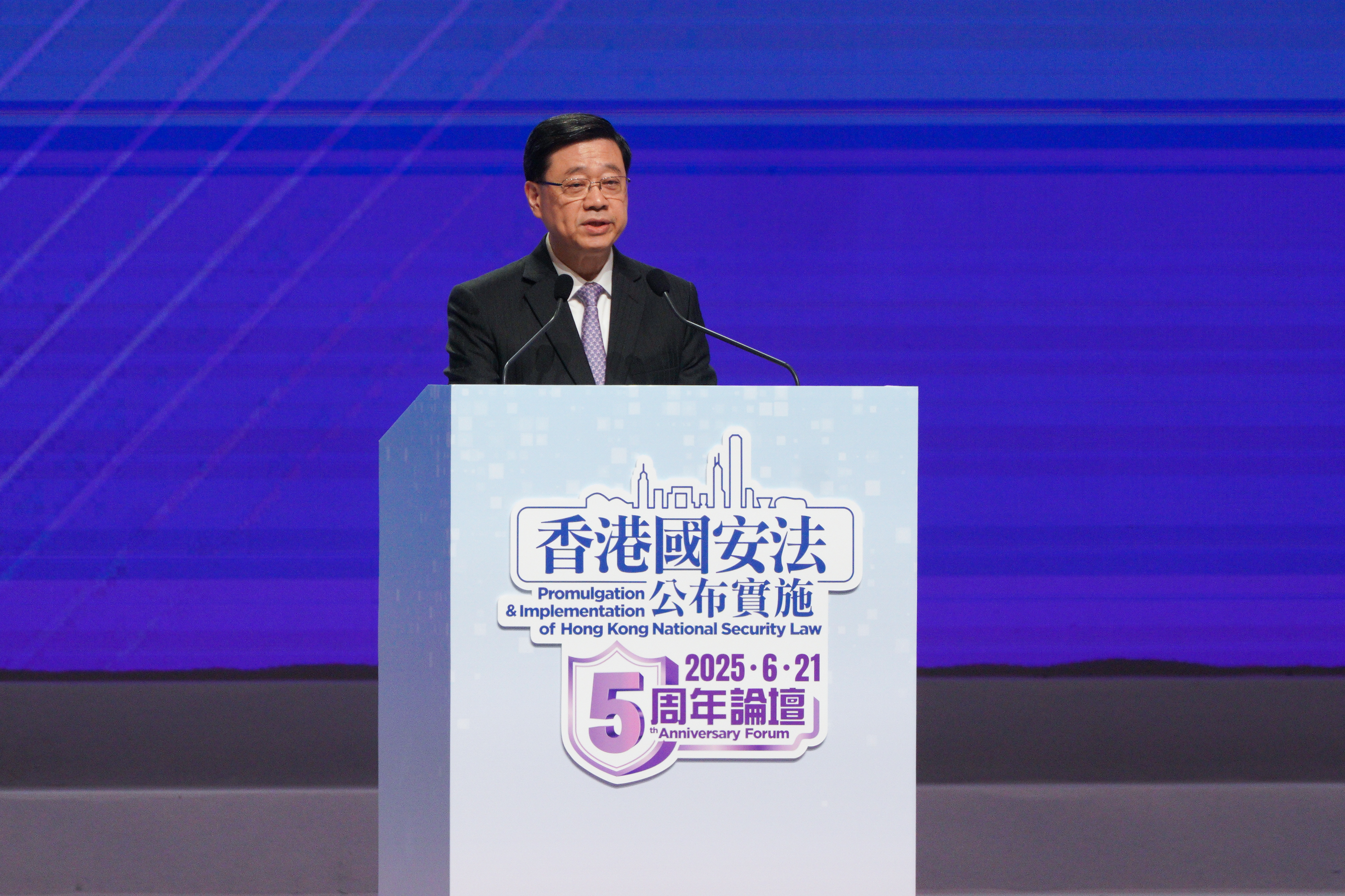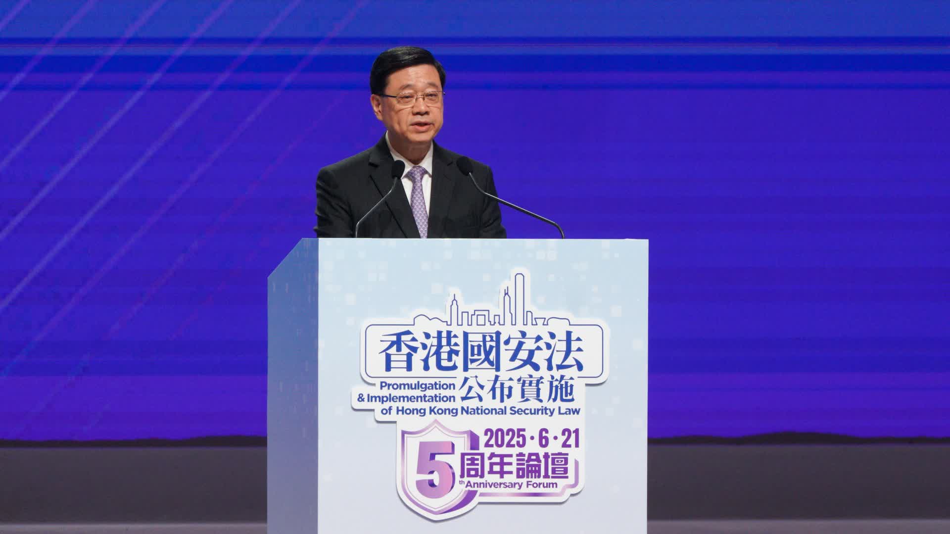 大公文匯全媒體報道,香港國安法公布實施五周年論壇今日(21日)在香港會議展覽中心大會堂舉行,中央港澳工作辦公室主任、國務院港澳事務辦公室主任夏寶龍,香港特別行政區行政長官、香港特別行政區維護國家安全委員會主席李家超發表主旨致辭,中央人民政府駐香港特別行政區聯絡辦公室主任、香港特別行政區維護國家安全委員會國家安全事務顧問周霽,全國人大常委會香港特別行政區基本法委員會副主任、全國人大常委會法制工作委員會副主任張勇,中央人民政府駐香港特別行政區維護國家安全公署署長董經緯,中華人民共和國外交部駐香港特別行政區特派員公署特派員崔建春,中國人民解放軍駐香港部隊司令員彭京堂致辭。