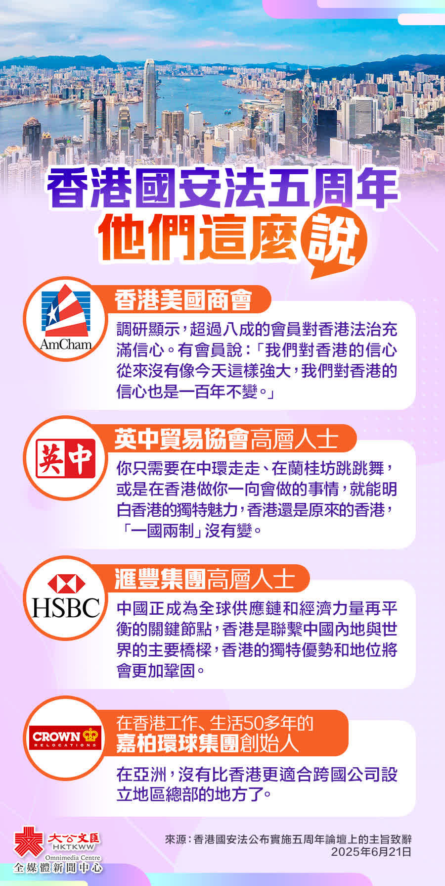大公文匯全媒體報道,香港國安法公布實施五周年論壇今日(21日)在香港會議展覽中心舉行,多位嘉賓出席並致辭。致辭提到,香港美國商會、英中貿易協會高層人士、滙豐集團高層人士,以及在香港工作、生活了50多年的嘉柏環球集團創始人,都對香港進行了高度評價,快來看看他們怎麼說!