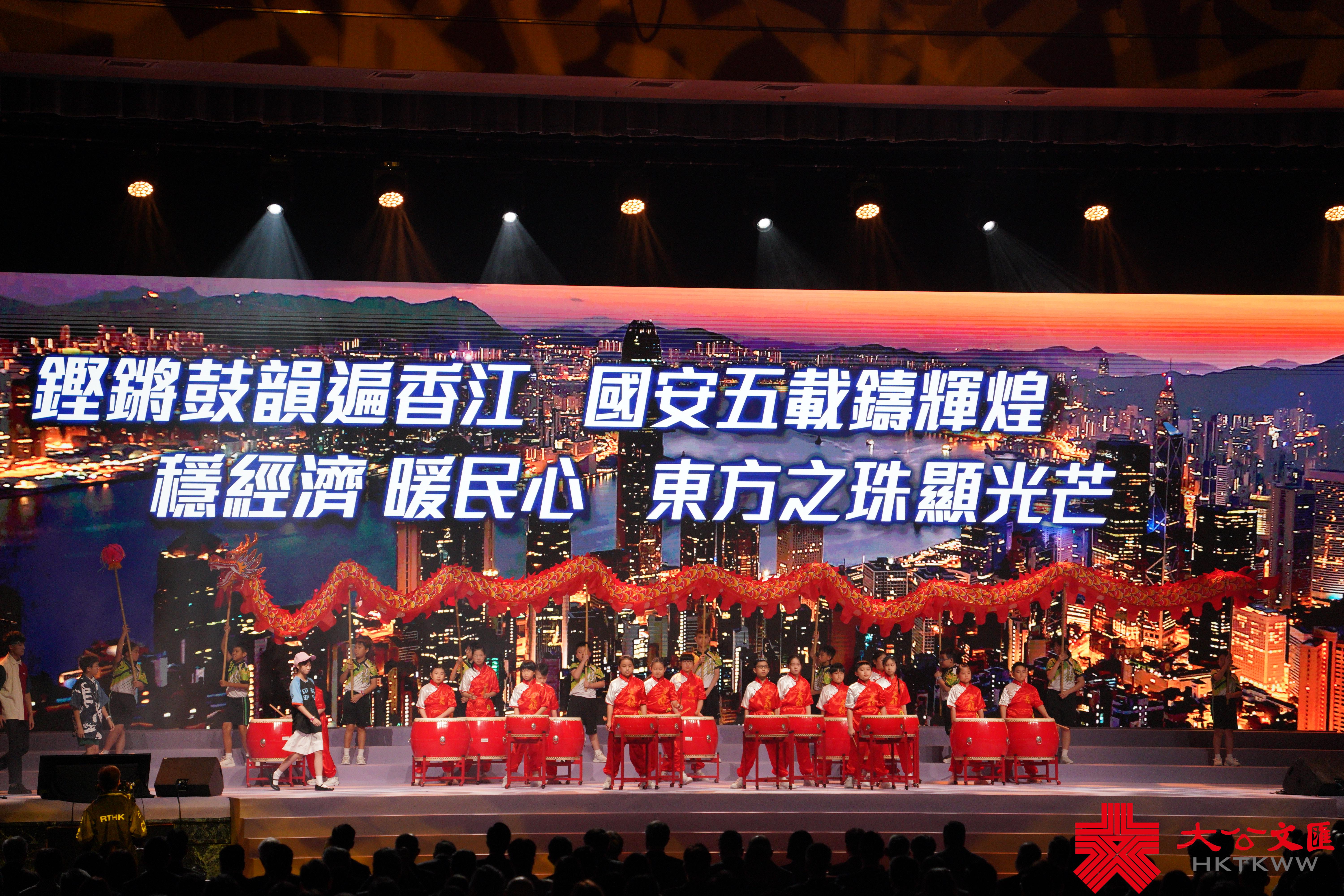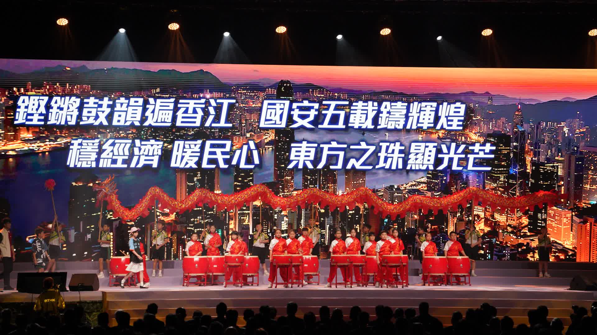 接着,社交媒體帖文創作獲獎學生們帶來表演「五載新希望 國安我擔當」,節目通過生動演繹,講述國安法在止暴除惡和保障居民權益等方面發揮的積極作用。當中還有舞龍、擊鼓等中華傳統藝術,及童聲合唱、民族舞蹈等表演。