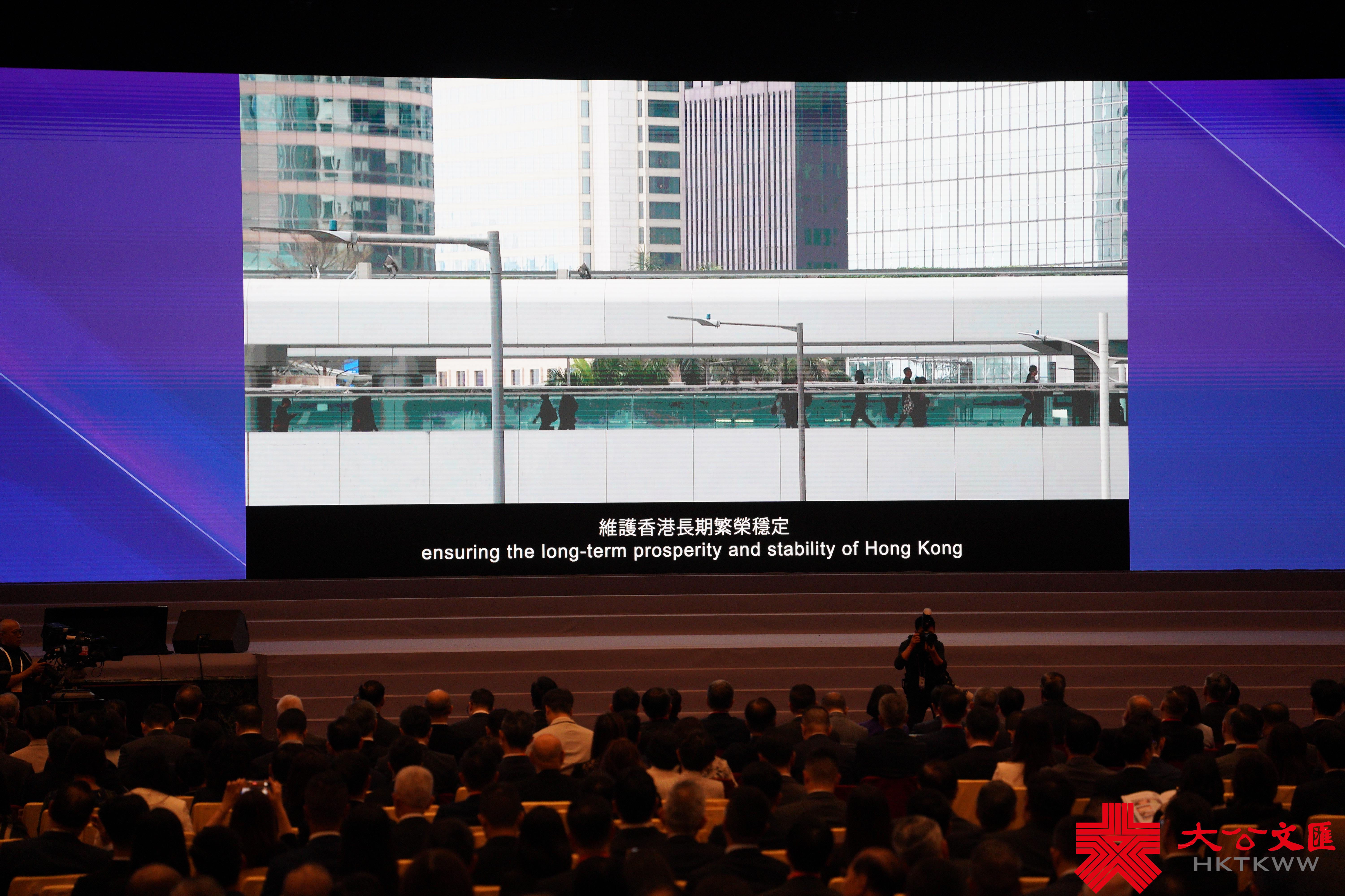 嘉賓致辭結束後播放香港國安法公布實施五周年影片——「正道」。影片回顧了國安法公布實施五年來,維護國家主權和安全發展利益、維持香港長期繁榮穩定、保障香港居民合法權益的點點滴滴,展現了國安法高水平地安全護航香港的高質量發展。