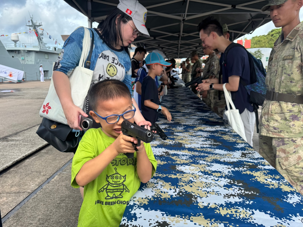 軍營開放期間,市民可以登上海軍艦艇、觀摩裝甲車輛、體驗模擬射擊及觀看軍隊表演等。有體驗槍械的小朋友興奮地表示,手槍比想像中的更重,軍人哥哥「好型」。現場所見,市民踴躍與駐香港部隊官兵合影,臉上洋溢着開心的笑容。