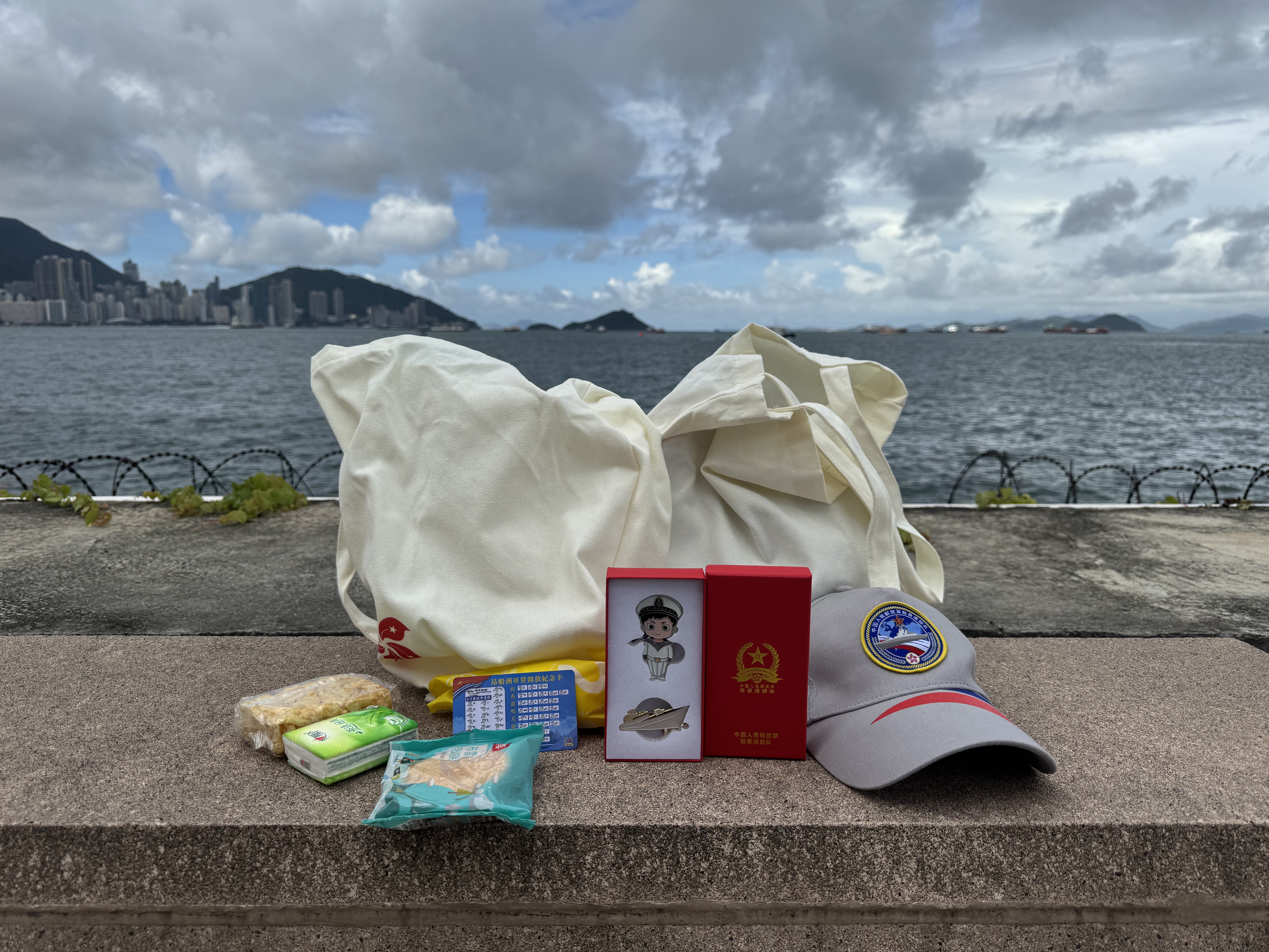市民可憑門票副券換領軍營開放日活動紀念品,根據現場參觀人士分享,禮袋內有海軍徽章、駐港部隊紀念帽和昂船洲軍營紀念卡,還為市民貼心準備了小零食和紙巾。