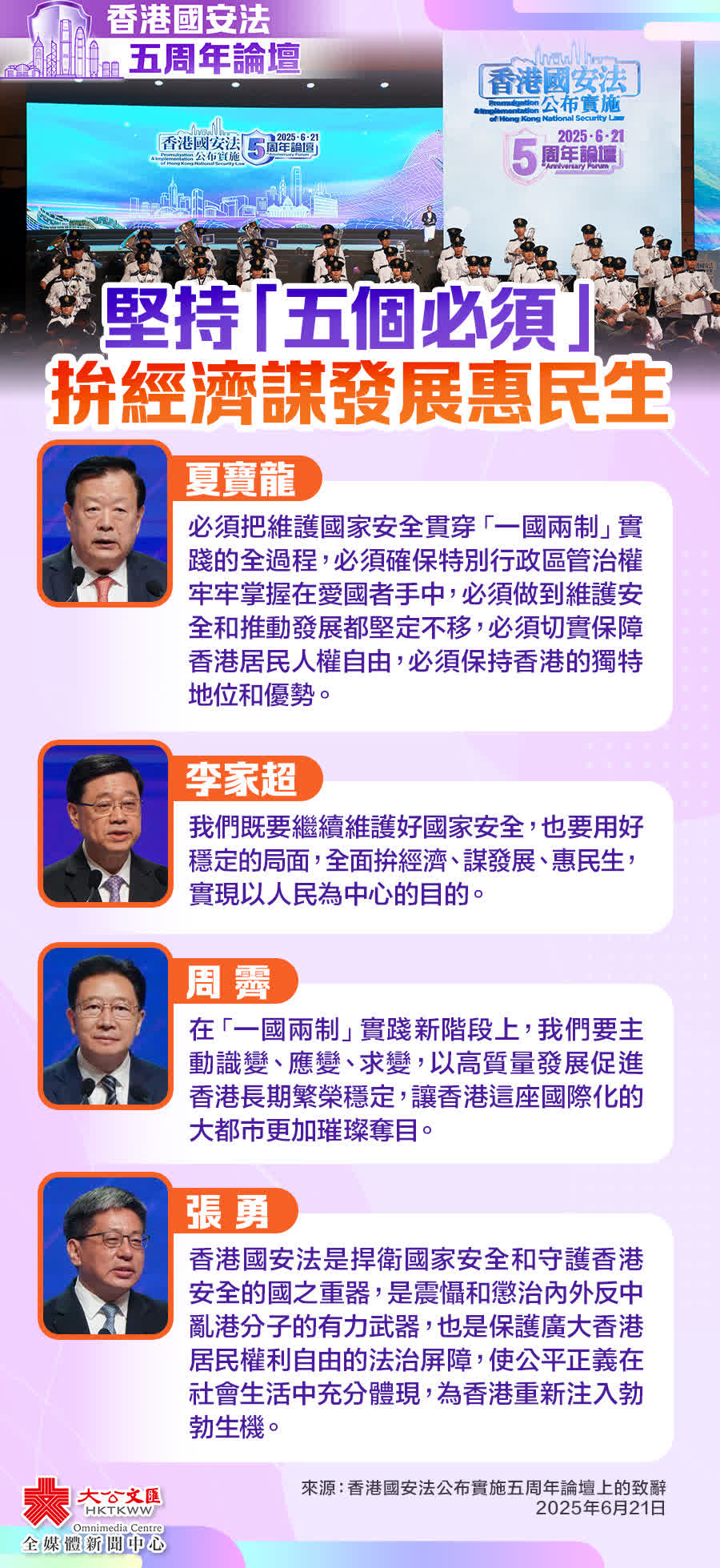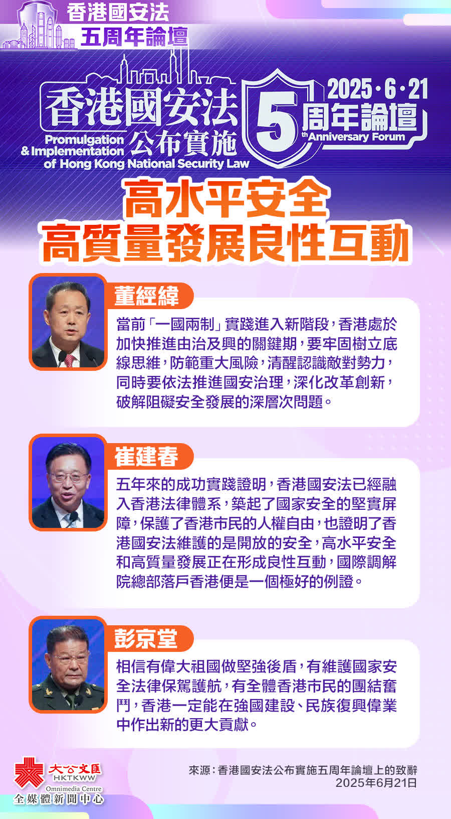 大公文匯全媒體報道,6月21日上午,香港特別行政區政府在香港會展中心舉辦香港國安法公布實施5周年論壇。香港社會各界近2000人參加活動。中央港澳工作辦公室主任、國務院港澳事務辦公室主任夏寶龍,香港特別行政區行政長官、香港特別行政區維護國家安全委員會主席李家超發表主旨致辭,中央人民政府駐香港特別行政區聯絡辦公室主任、香港特別行政區維護國家安全委員會國家安全事務顧問周霽,全國人大常委會香港特別行政區基本法委員會副主任、全國人大常委會法制工作委員會副主任張勇,中央人民政府駐香港特別行政區維護國家安全公署署長董經緯,中華人民共和國外交部駐香港特別行政區特派員公署特派員崔建春,中國人民解放軍駐香港部隊司令員彭京堂致辭。大公文匯全媒體整理嘉賓致辭要點,快來一文睇清!