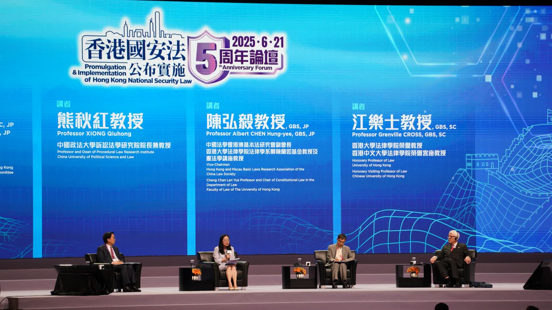 (大公文匯全媒體記者 周傾芫)香港國安法公布實施五周年論壇今日(21日)在香港會議展覽中心大會堂舉行。下午座談環節分為兩節。第一節座談會的主題為回顧香港國安法的立法原意和背景,及其對法律制度的創新,探討香港國安法、《維護國家安全條例》與本地法律兼容互補下的有益成果,以及國際社會對其司法公正性的認可。座談會由全國人大常委會香港特別行政區基本法委員會委員、香港特別行政區選舉委員會委員王鳴峰主持。