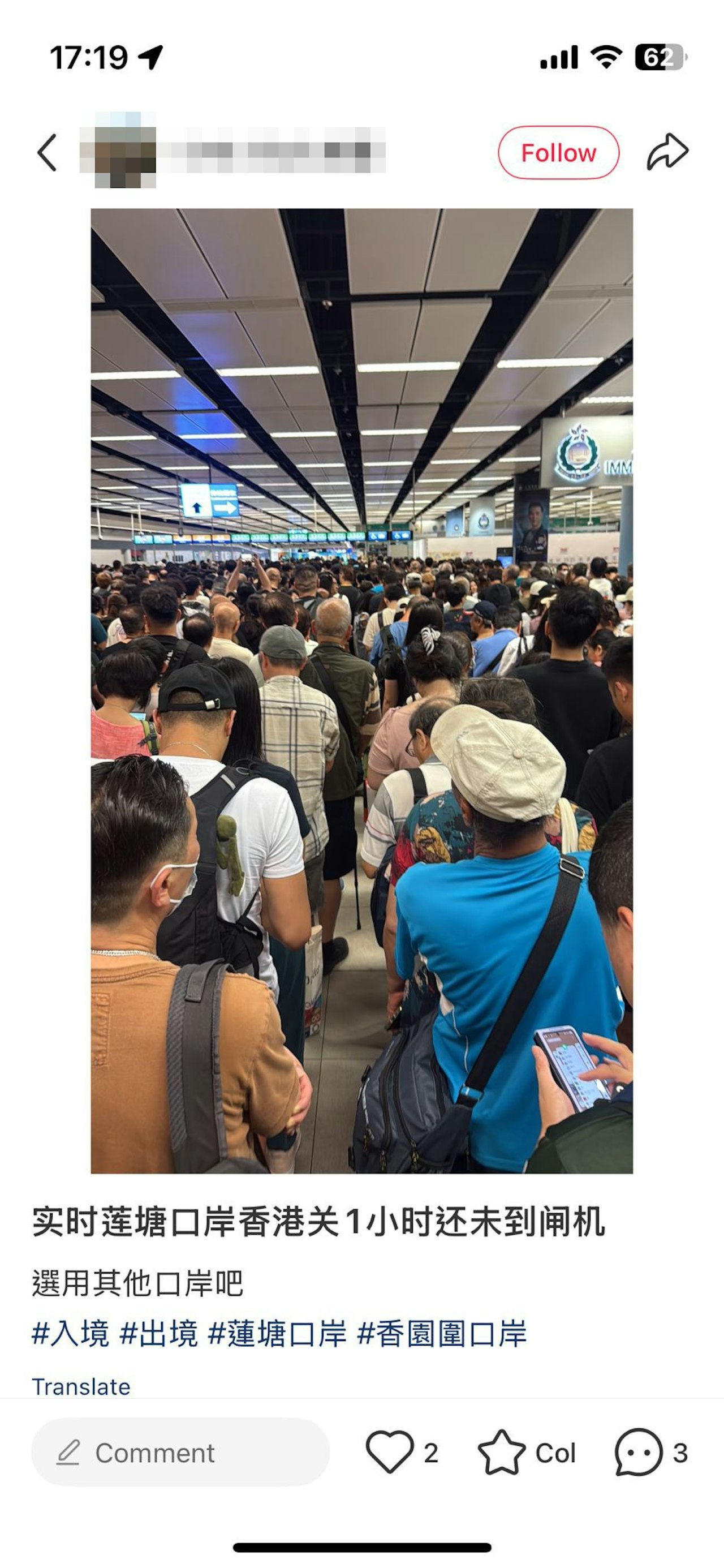 社交平台小紅書上有不少旅客都發文指,出境香港時遇見人潮,形容「人擠人擠不動」,在過關位更排起人龍,等近1小時都未到離境閘位,呼籲網民使用其他陸路口岸。