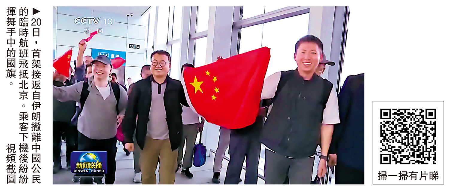 大公報援引央視新聞報道,首架接返自伊朗撤離中國公民的臨時航班20日傍晚抵達北京,330名中國公民搭乘該航班順利回到祖國。