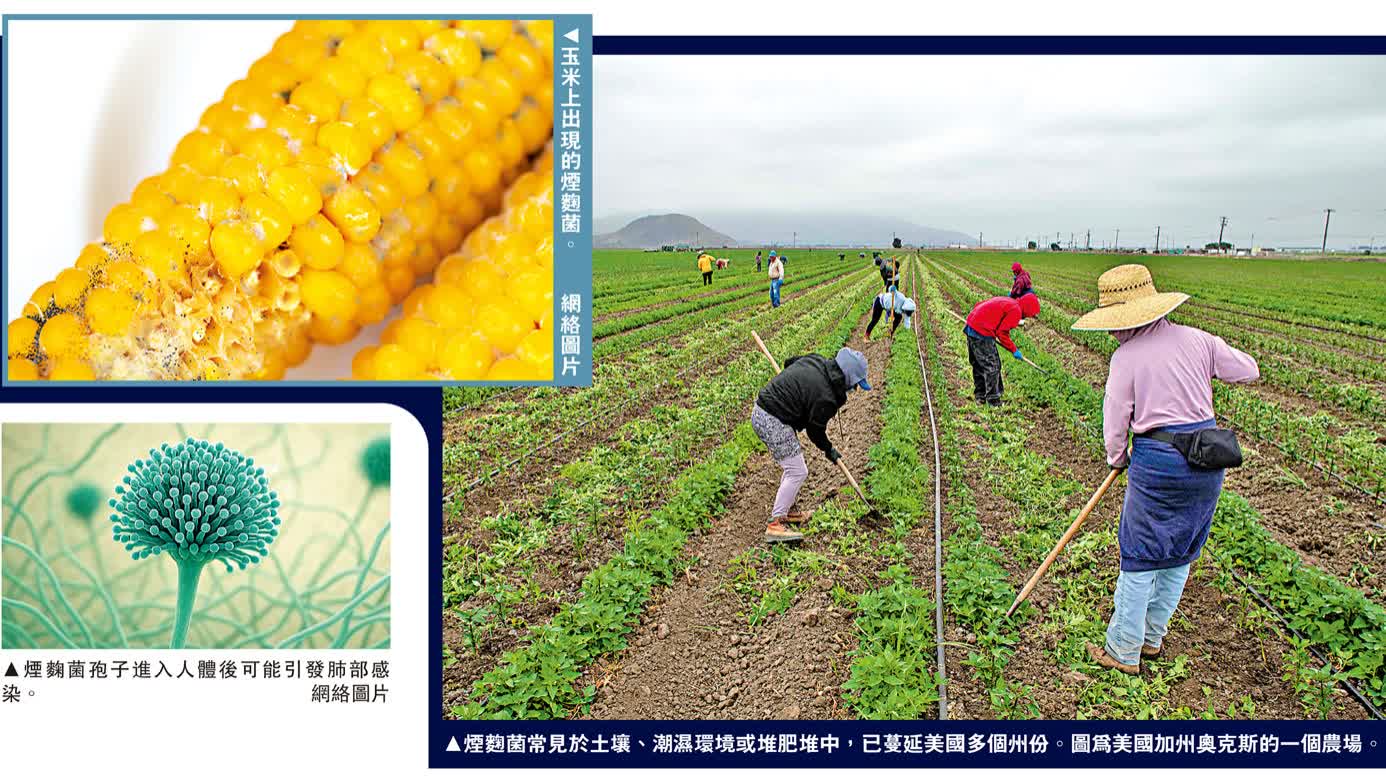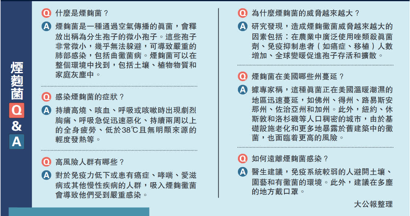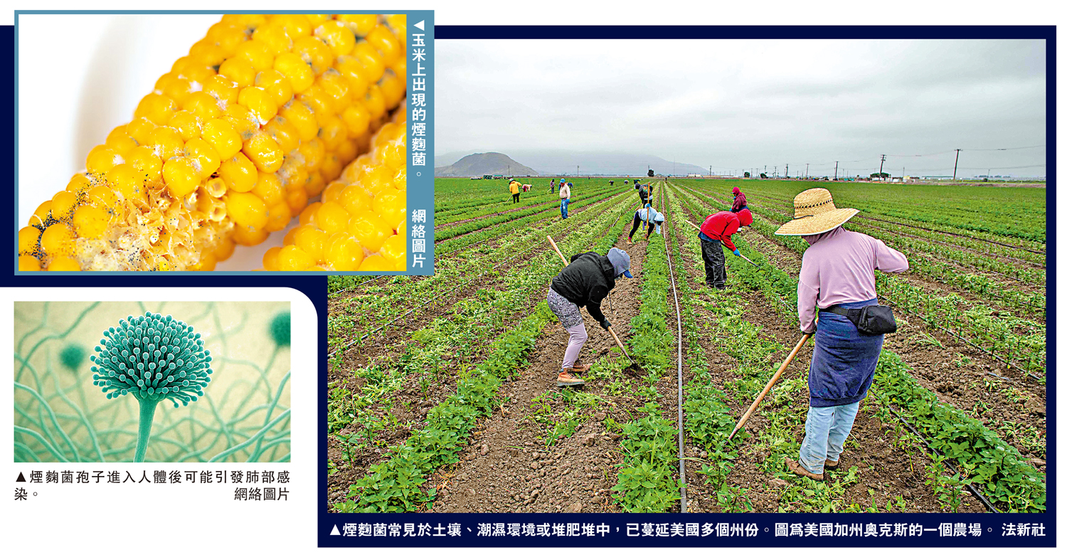 大公報綜合報道,一種名為煙麴菌的致命真菌,正在美國境內多州迅速蔓延。這種真菌可「從內部吞噬人體」,引發人體出現曲霉病(一種嚴重的肺部感染),可能會導致器官衰竭和死亡。專家警告,隨着氣候暖化加劇,煙麴菌蔓延問題可能會惡化,給免疫系統較弱人群帶來極高風險。