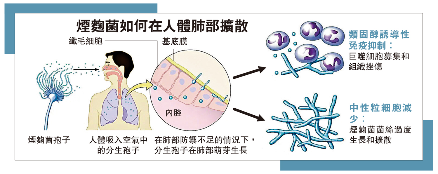 煙麴菌可通過空氣傳播,其孢子非常微小,人體幾乎無法避免將其吸入。衞生專家指出,民眾吸入煙麴菌,孢子進入人體後,如果免疫系統無法清除孢子,這種真菌「就會開始生長,基本上會從內到外吞噬你」,引發一種名為曲霉病的嚴重肺部感染,具有潛在致命性。對於免疫系統弱的患者,如癌症患者、哮喘患者和愛滋病毒(HIV)感染者,更可能導致器官衰竭,甚至有生命危險。