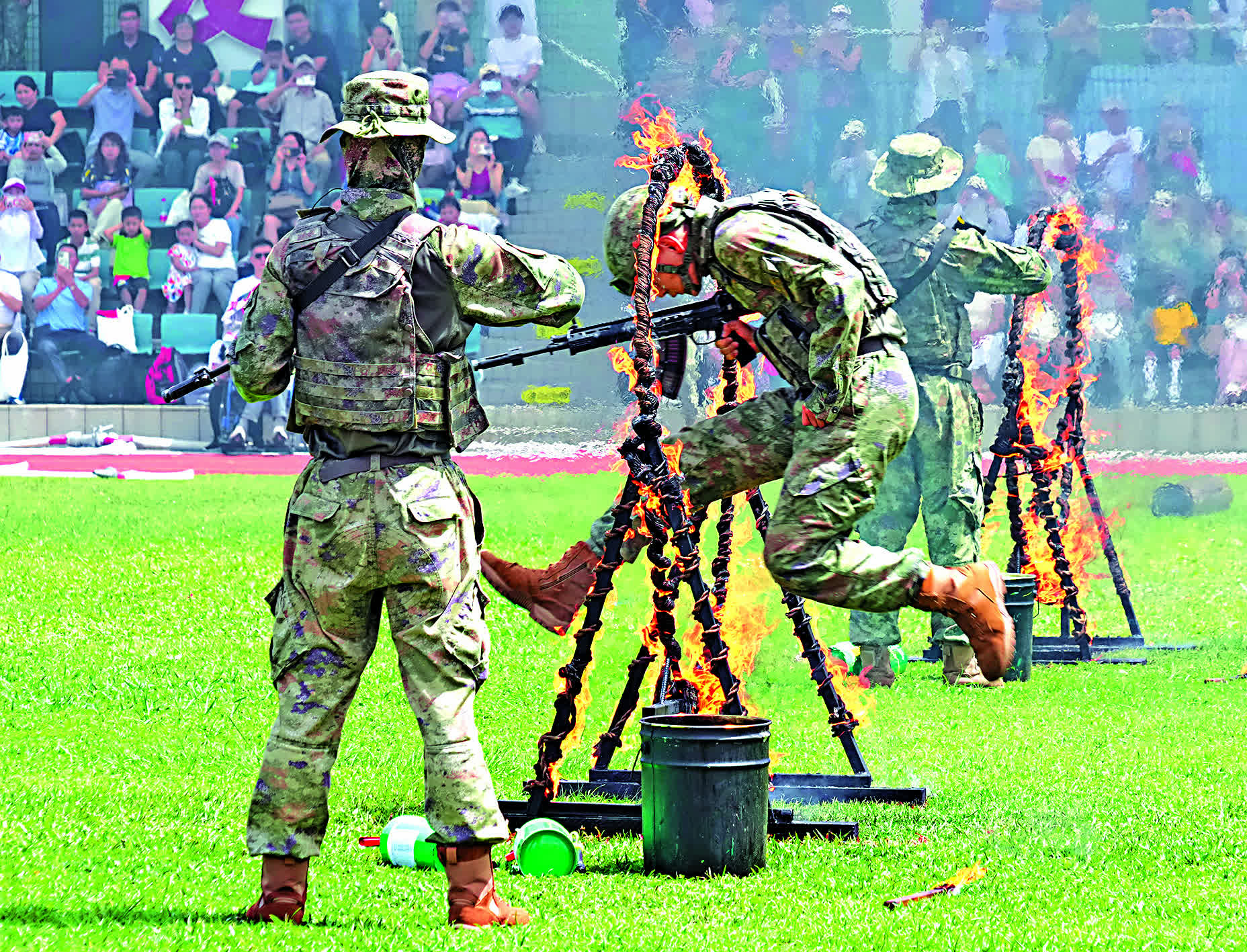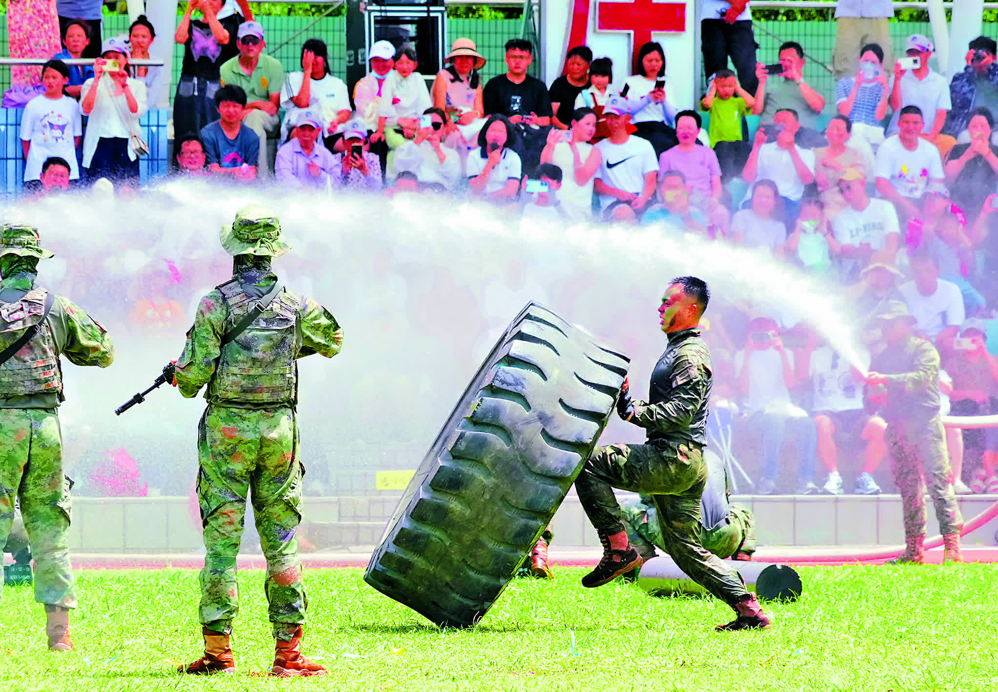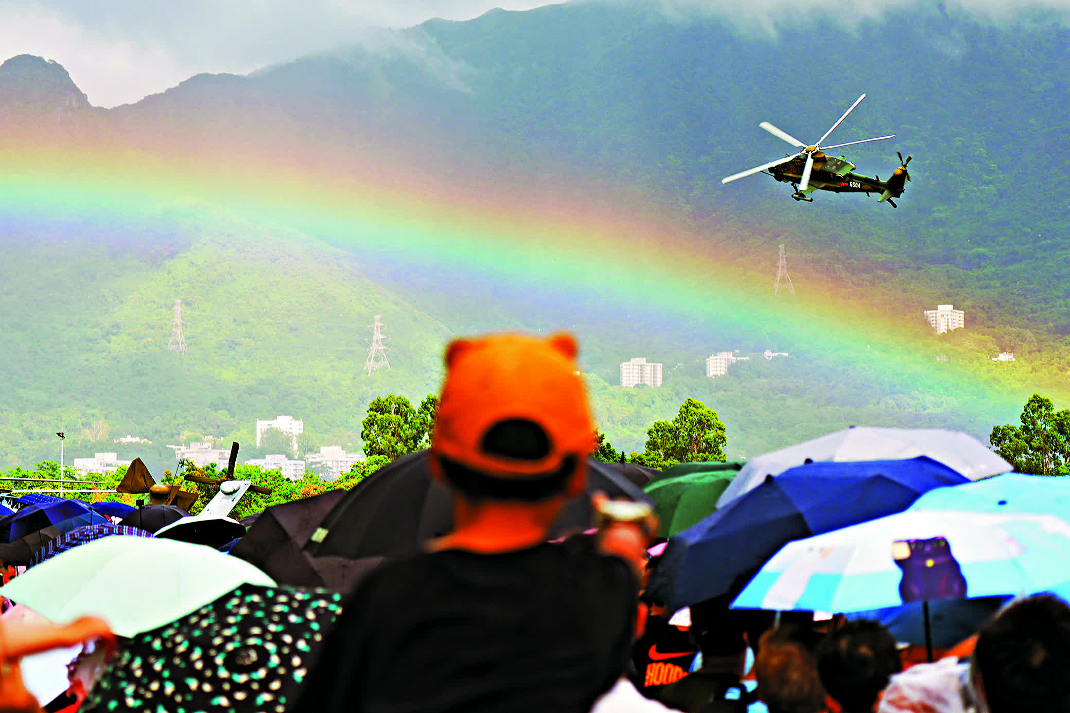 除了升旗禮,軍營內亦舉辦武器裝備展示及直升機飛行表演,吸引大批市民駐足。裝備展示區以自由參觀、互動操作及問答解說形式進行,「軍迷」們爭相與裝甲車、輕武器合影,現場不時傳出「這款步槍的射程幾遠?」「直升機何解可以懸停?」的熱切提問。最震撼的莫過於石崗軍營的直升機飛行表演──駐軍飛行員駕駛國產直升機接連完成蛇形機動、回轉後飛、躍升倒轉等高難度動作,既展現裝備優越性能,更彰顯飛行員過硬戰術素養,不少市民舉起手機錄影,現場氣氛熱烈非凡。