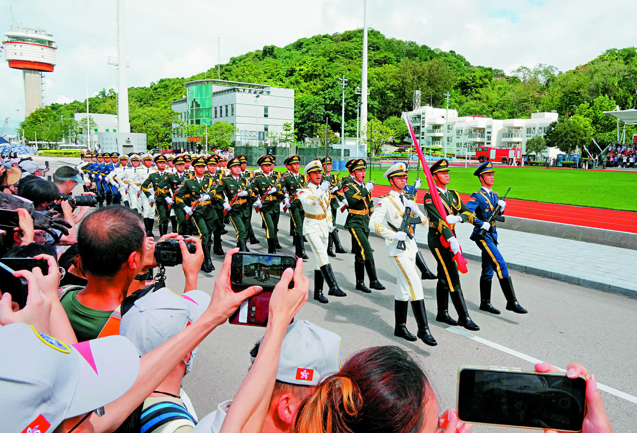昂船洲軍營昨日早上9時開放,有市民最早於7時半就前往排隊。上午10時,昂船洲軍營準時開始升國旗儀式,在激昂雄壯的國歌聲中,儀仗隊邁着鏗鏘有力的步伐入場,全場肅立,合唱國歌;在隨後進行的刺殺操、獵人戰鬥等課目表演中,駐軍官兵展示過硬軍事技能,贏得觀眾熱烈掌聲。