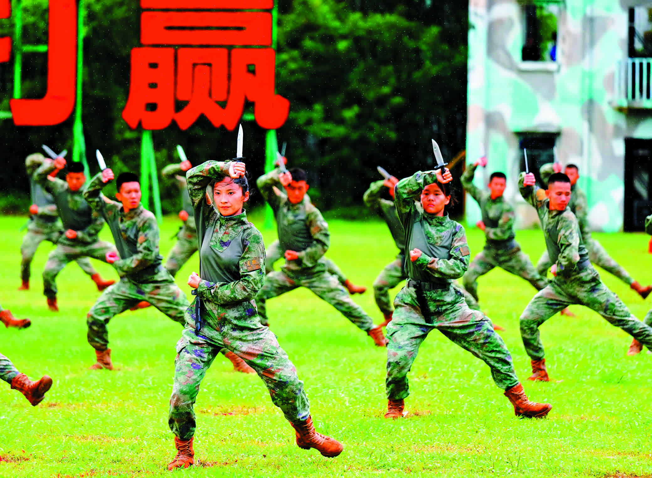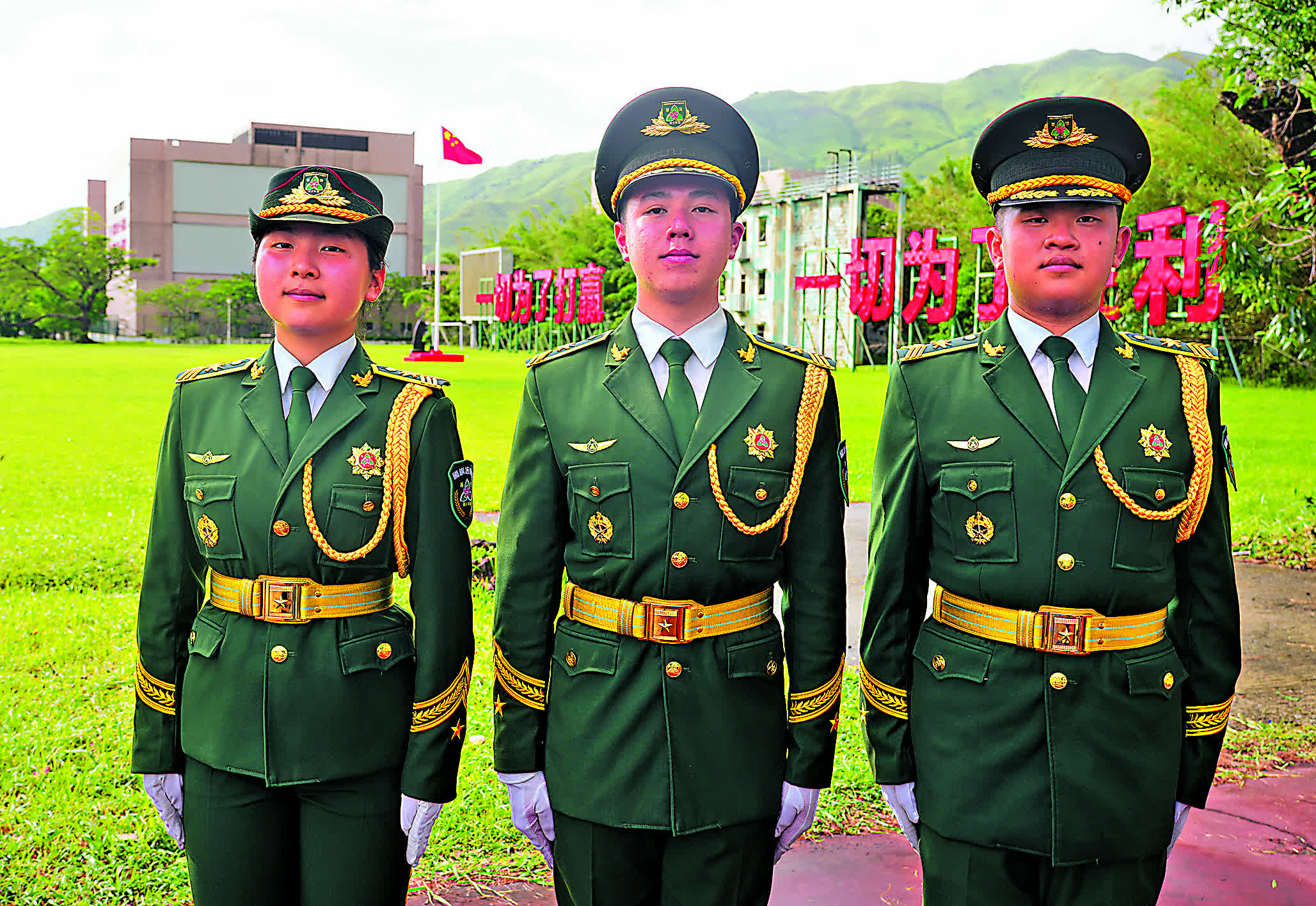 中國人民解放軍駐港部隊6月21日開放石崗軍營。雖然突降綿綿細雨,駐港部隊官兵與青少年國旗護衛隊員仍並列站隊,雨水順着帽檐滑落,卻絲毫未動搖隊員們的站姿,濕潤的地面只映出護旗隊員筆挺的身影。