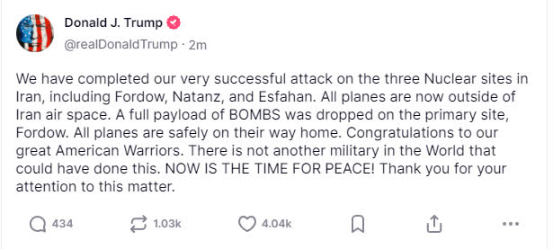 據環球網報道,剛剛,美國總統特朗普在其社交媒體上發布一張圖,上面文字顯示「伊朗的福爾多(核設施)已不存在」。