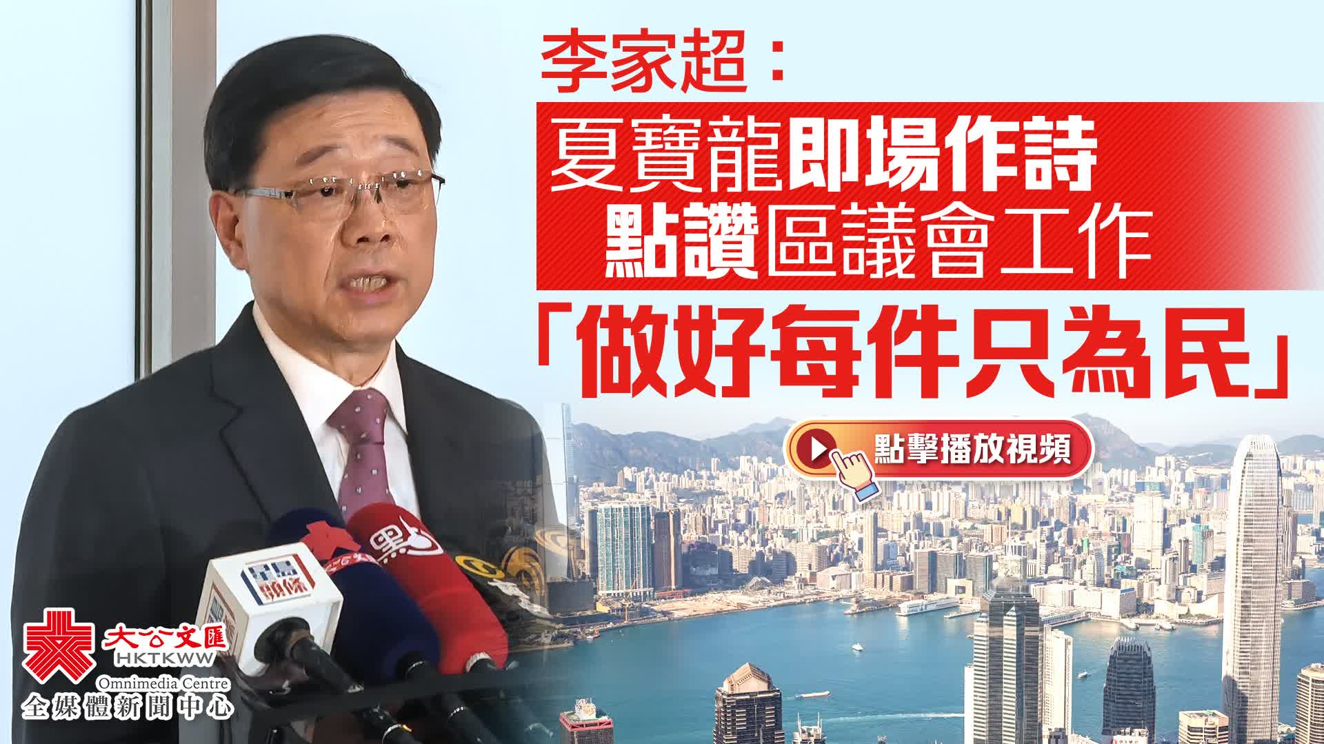 (大公文匯全媒體記者 王俊傑)中央港澳工作辦公室主任、國務院港澳事務辦公室主任夏寶龍今日(22日)經深圳灣口岸離港。行政長官李家超於深圳灣口岸會見傳媒時總結夏寶龍主任五天行程並作總結。他提及,夏寶龍今早聽取18區區議會主席匯報,並即場作詩為區議會「點讚」:「千頭萬緒區議會,胸有大愛善良心,事無巨細皆為大,做好每件只為民。」