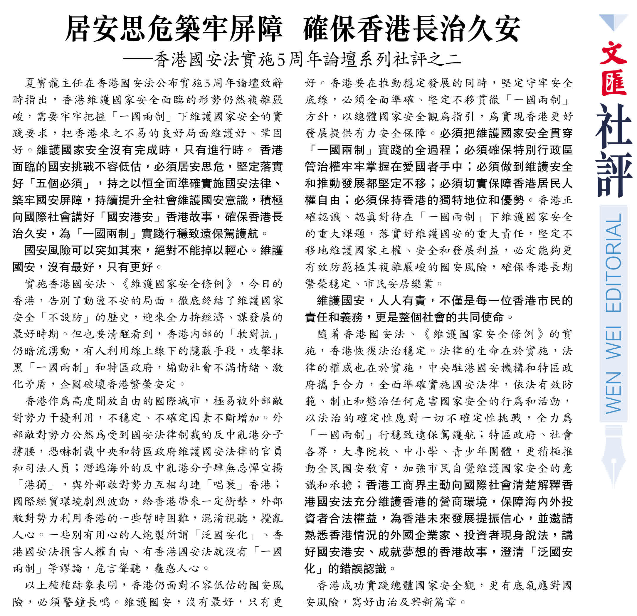 夏寶龍主任在香港國安法公布實施5周年論壇致辭時指出,香港維護國家安全面臨的形勢仍然複雜嚴峻,需要牢牢把握「一國兩制」下維護國家安全的實踐要求,把香港來之不易的良好局面維護好、鞏固好。維護國家安全沒有完成時,只有進行時。 香港面臨的國安挑戰不容低估,必須居安思危,堅定落實好「五個必須」,持之以恒全面準確實施國安法律、築牢國安屏障,持續提升全社會維護國安意識,積極向國際社會講好「國安港安」香港故事,確保香港長治久安,為「一國兩制」實踐行穩致遠保駕護航。