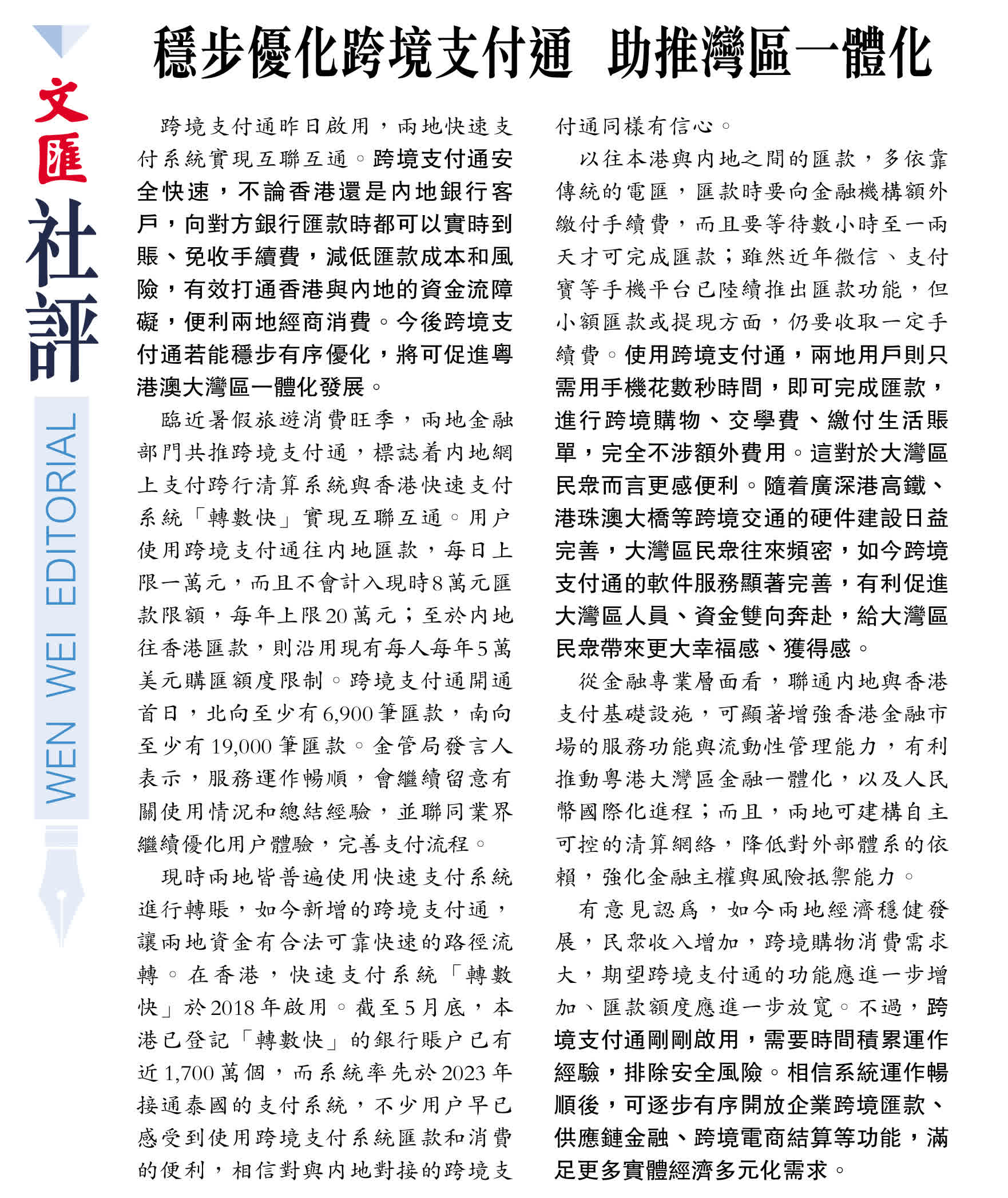 跨境支付通昨日啟用,兩地快速支付系統實現互聯互通。跨境支付通安全快速,不論香港還是內地銀行客戶,向對方銀行匯款時都可以實時到賬、免收手續費,減低匯款成本和風險,有效打通香港與內地的資金流障礙,便利兩地經商消費。今後跨境支付通若能穩步有序優化,將可促進粵港澳大灣區一體化發展。