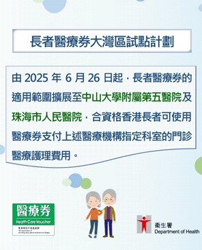 政府今日(六月二十三日)公布,位於珠海市的中山大學附屬第五醫院(中山五院)和珠海市人民醫院(珠海醫院)將由六月二十六日(星期四)起開展「長者醫療券大灣區試點計劃」(「試點計劃」),接受合資格香港長者使用長者醫療券(醫療券)支付指定科室的門診醫療護理服務費用。計及兩個新增服務點,粵港澳大灣區(大灣區)內可以使用醫療券的服務點增至11個,讓超過178萬名合資格的香港長者受惠。