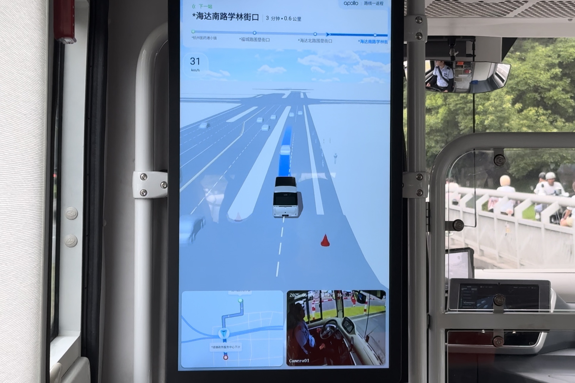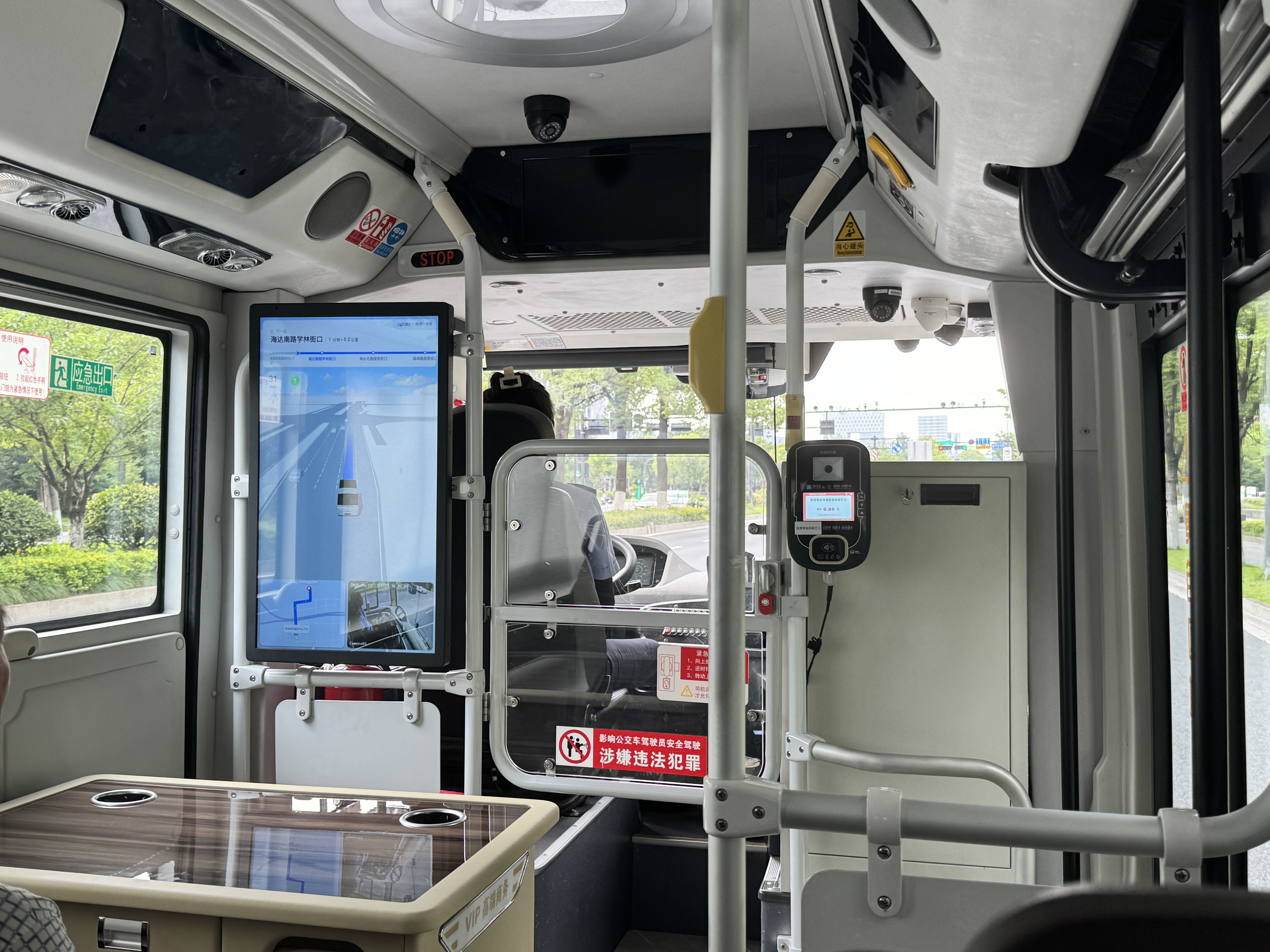 記者搭乘的是工作日運行的自動駕駛巴士,在錢塘政務服務中心(下沙)至杭州醫藥港小鎮之間開行。登上巴士,可見車上仍配備了一位司機,以實時監測運行狀態。司機雖坐在駕駛座的位置上,但手放在其大腿上未握住方向盤,保持着掌心向上的姿勢。車內布置與普通巴士區別不大,唯有一面位於駕駛座後方的電子屏幕十分顯眼。在巴士運行時,屏幕上會顯示車輛的實時路線圖與車身周圍的車輛、行人等信息,還有一個駕駛位監控畫面。