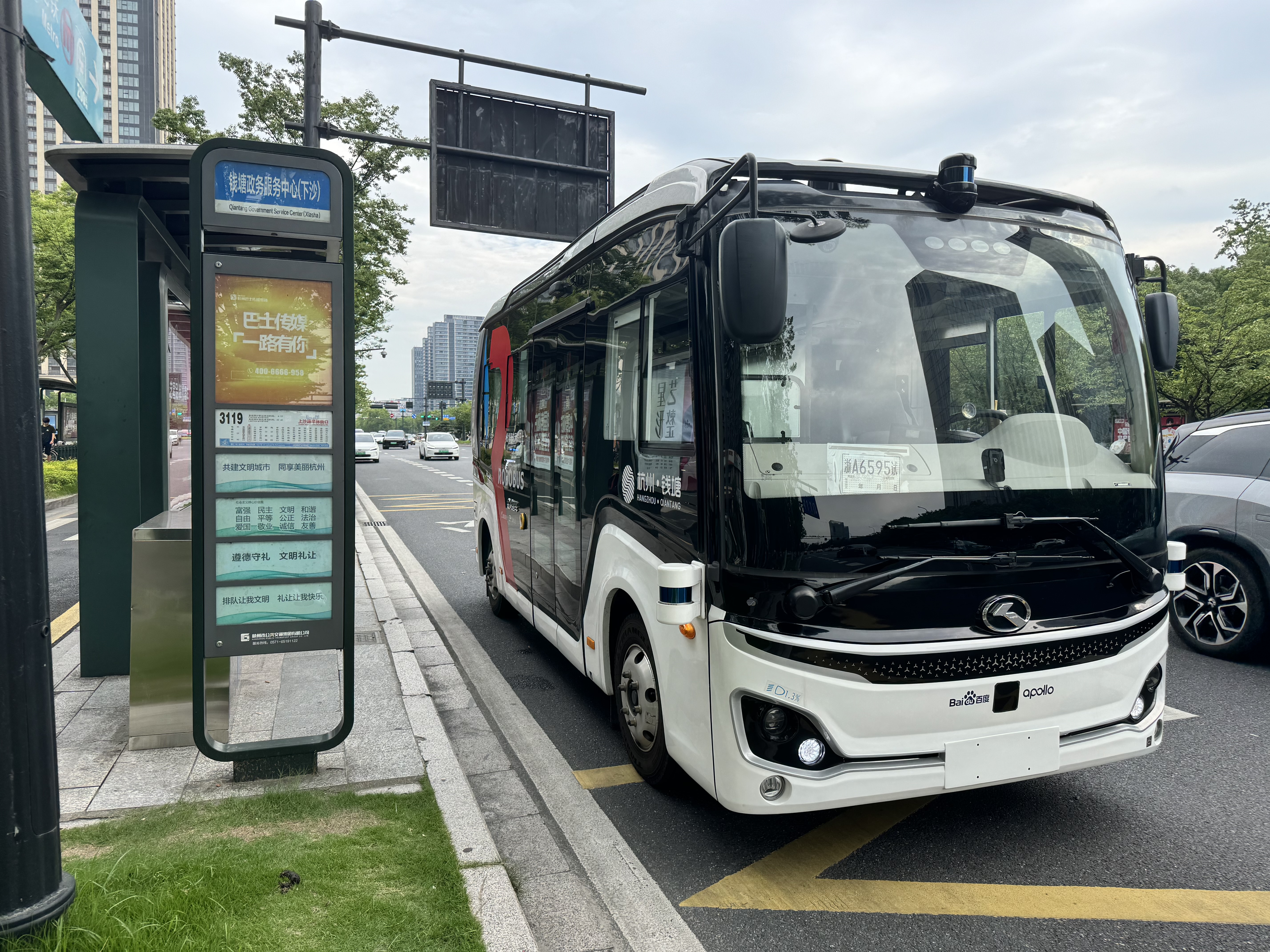 工作日的午後,在杭州錢塘政務服務中心站前,記者搭乘上了正在試運行的自動駕駛巴士。
