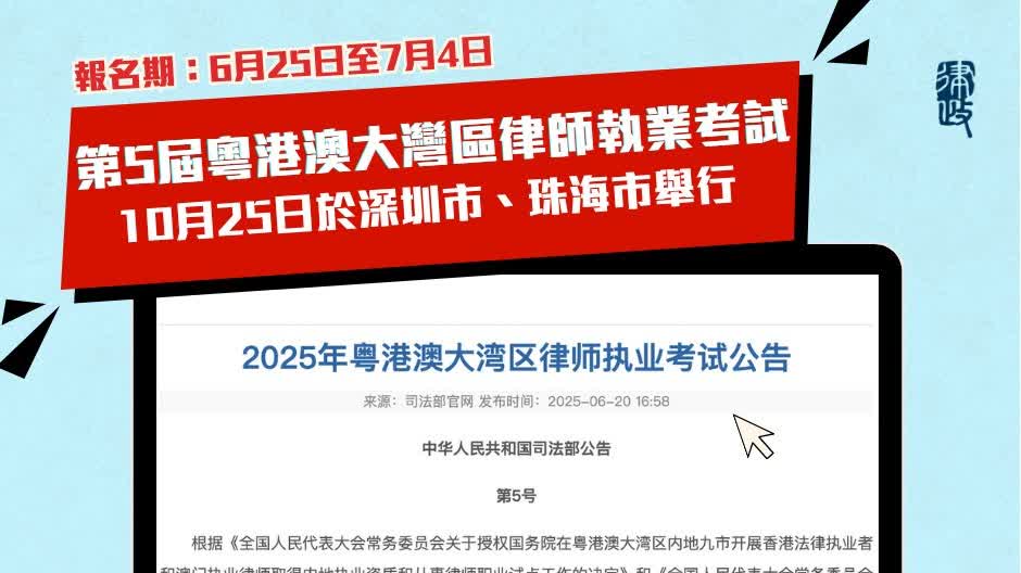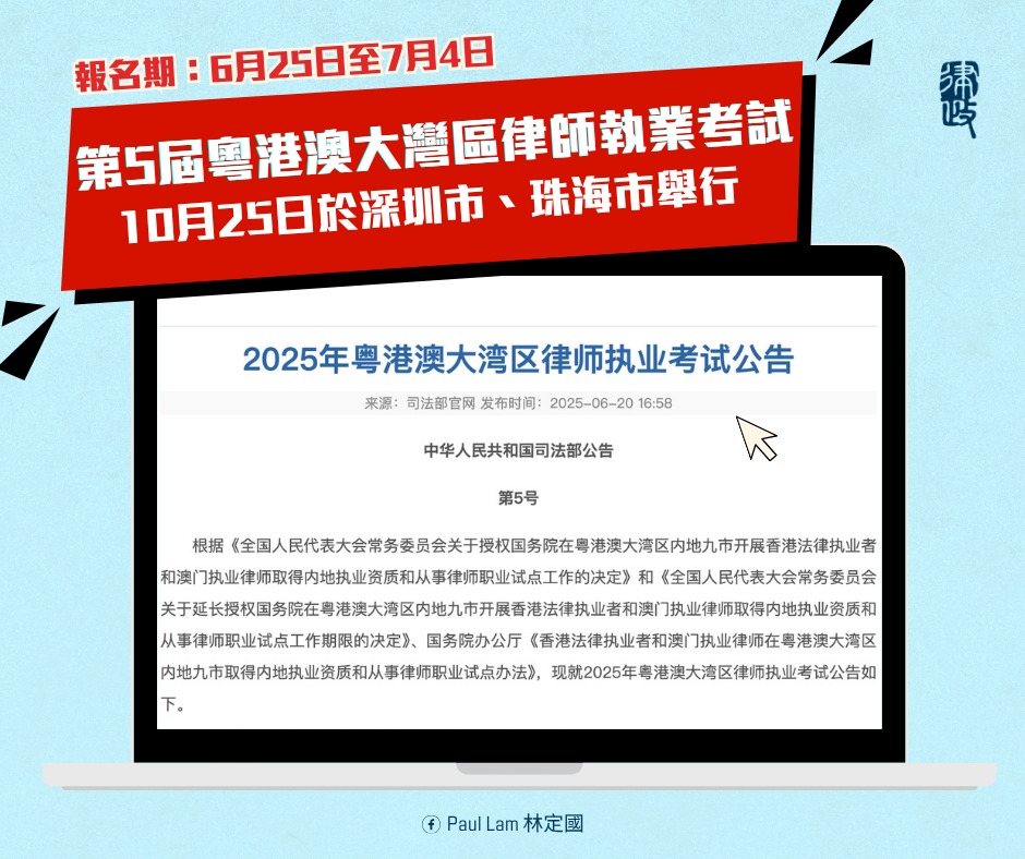 大公文匯全媒體報道,律政司司長林定國今日(23日)在社交平台發文指,司法部上星期五(20日)公告,2025年粵港澳大灣區律師執業考試(大灣區考試)訂於10月25日在廣東省深圳市、珠海市舉行,符合條件者可於周三(25日)至7月4日登錄司法部網站報名。