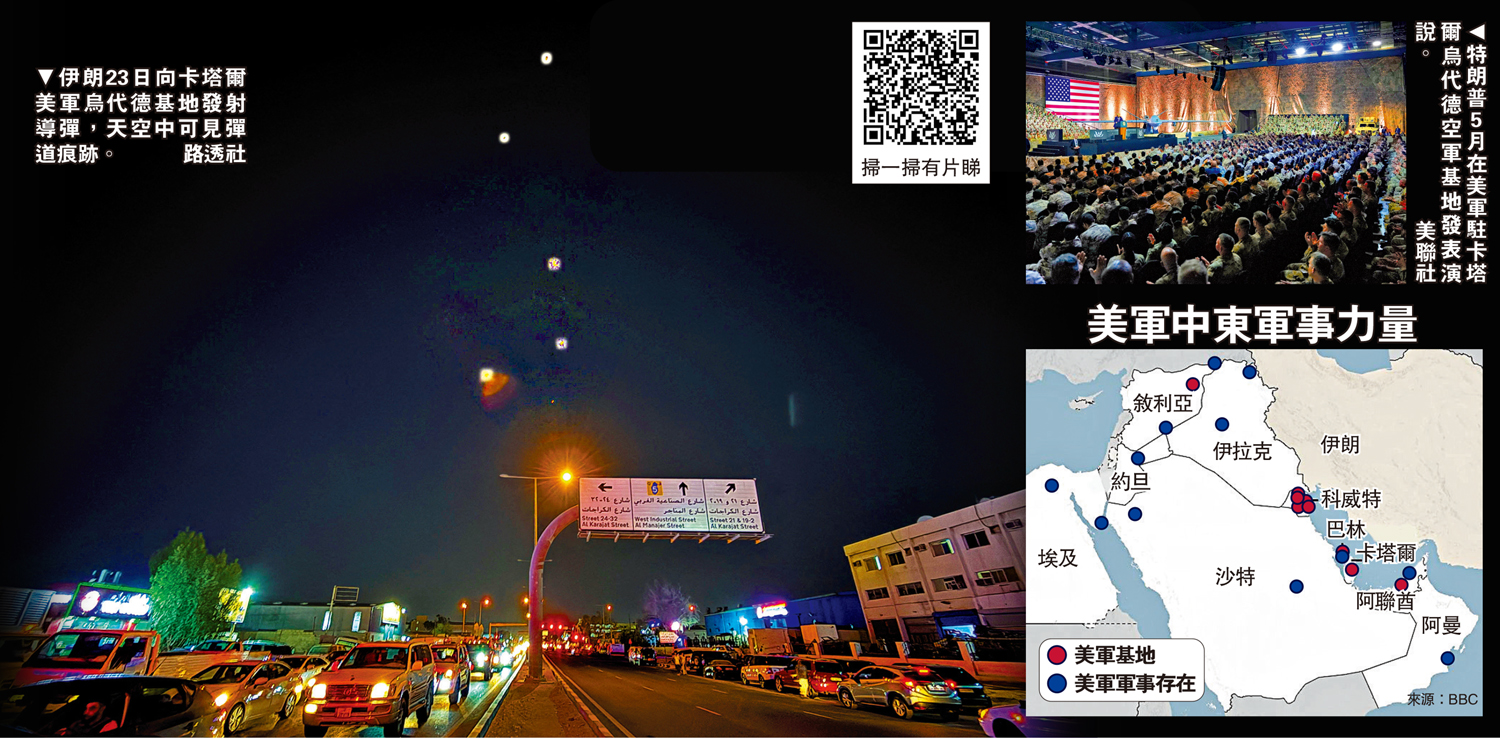 (大公報記者 任芳頡 郭 嘉)美國襲擊伊朗三大關鍵核設施後,外界關注伊朗將如何回擊。當地時間6月23日夜間,本港時間24日凌晨,伊朗武裝部隊發布聲明,宣布對美軍駐卡塔爾烏代德空軍基地實施導彈打擊。