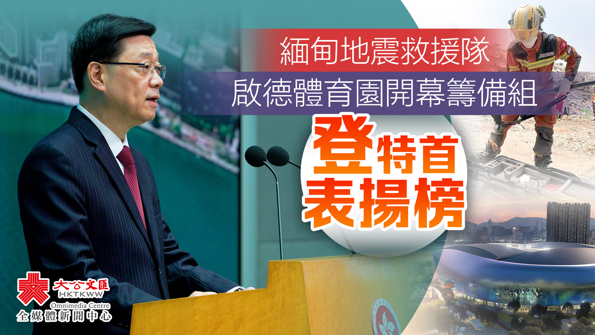 大公文匯全媒體報道,行政長官李家超今日(24日)出席行政會議前見記者,公布今年「行政長官表揚榜」,分別由赴緬甸地震災區救援的特區救援隊,以及負責啟德體育園開幕的跨部門籌備專組獲得。李家超指,兩支團隊以專業精神及高效協作,為香港爭光,充分體現公務員的卓越能力。