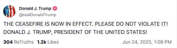 據央視新聞報道,美國東部時間24日凌晨1時許,美國總統特朗普在社交媒體發布消息稱,「停火現已生效,請勿違反。」