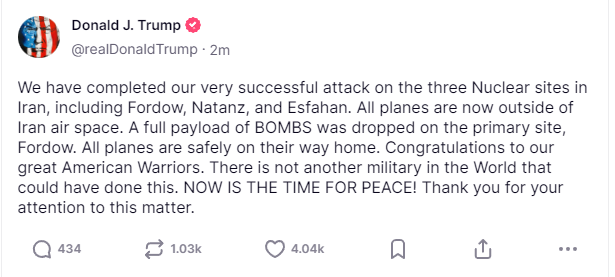 美國白宮新聞秘書卡羅琳·萊維特19日說,特朗普將在「接下來兩周內」決定是否下令美軍對伊朗發動打擊。21日,特朗普在其社交媒體「真實社交」上發文稱,美國已完成對伊朗福爾多、納坦茲和伊斯法罕三處核設施的襲擊。連兩天都沒到,美軍就對伊朗核設施發動了突然攻擊。