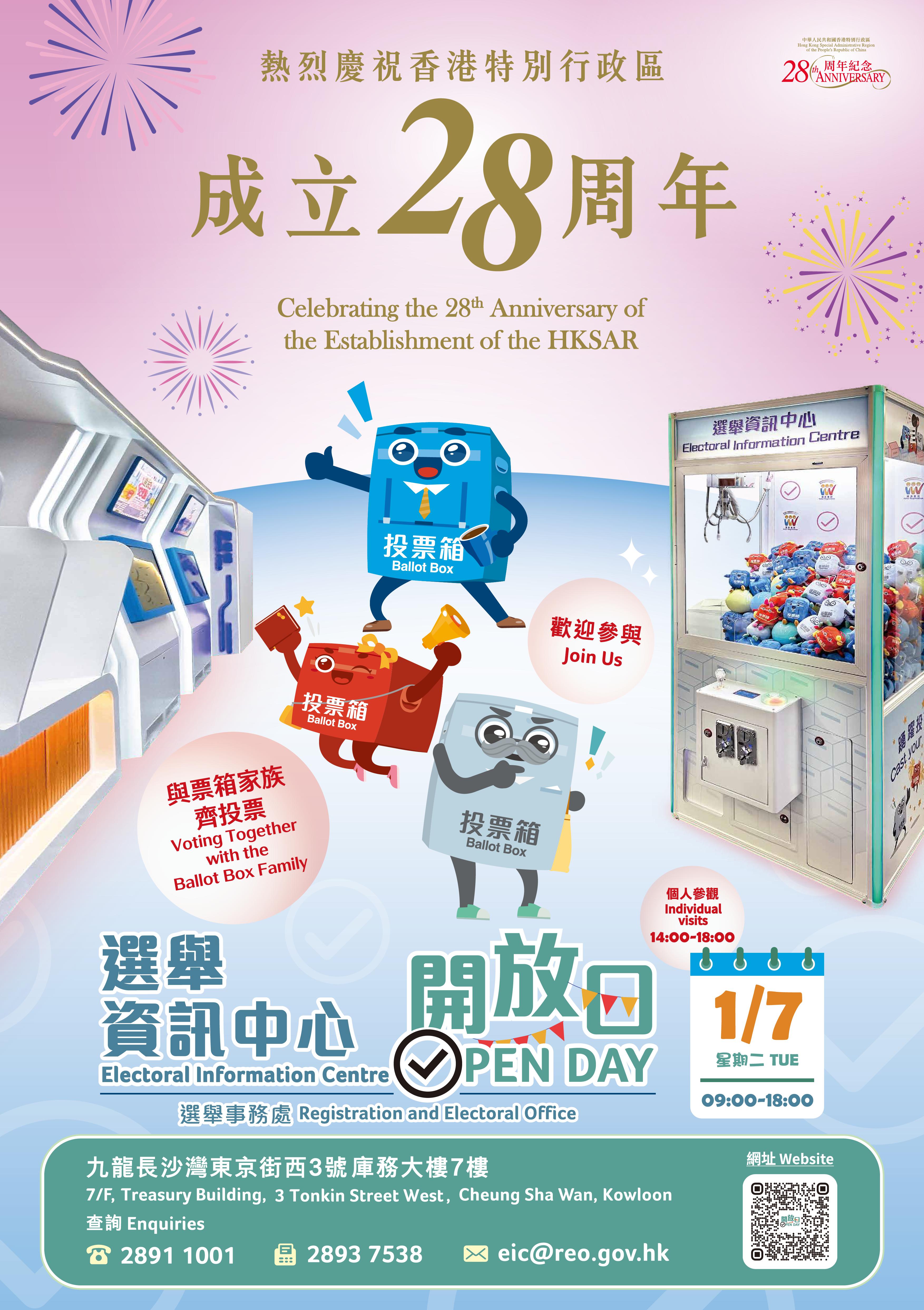 大公文匯全媒體報道,為慶祝香港特別行政區成立28周年,選舉事務處今日(24日)宣布,將於下周二(7月1日)舉辦選舉資訊中心開放日,與市民共慶回歸。