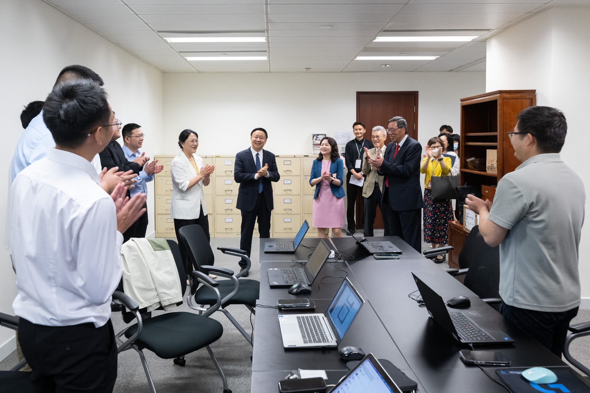 演示結束後,梁君彥與劉慶峰前往字幕製作「人機合一」的核心地帶——秘書處人員使用AI系統同步進行實時監察、編校字幕,和作最後把關的辦公地方。同場,與秘書處幕後團隊相鄰,亦有科大訊飛的駐場人員隨時候命,提供及時、專業的技術支援。梁君彥表示,劉慶峰董事長親自勉勵科大訊飛工作團隊,確保這項極具意義的創新項目能順利推進。