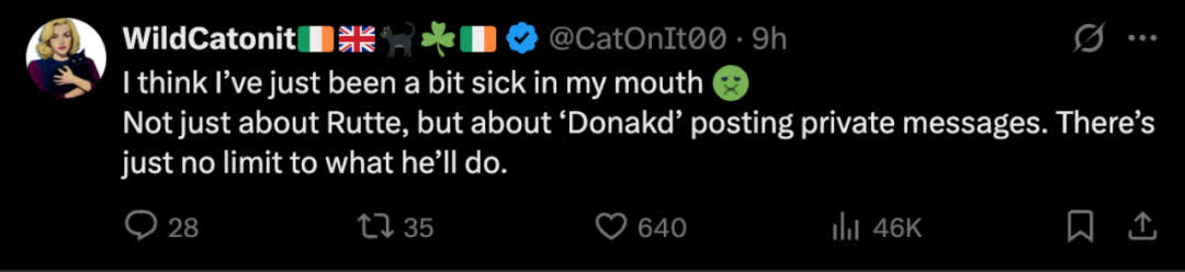 有網友表示,「我感覺有點反胃。不僅僅是因為呂特,還因為『唐納德』公開私人短訊。他的所作所為簡直毫無底線」。