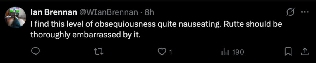 有網友說,「我覺得這種過分的諂媚行為實在令人反感。呂特應該為此感到極其尷尬」。