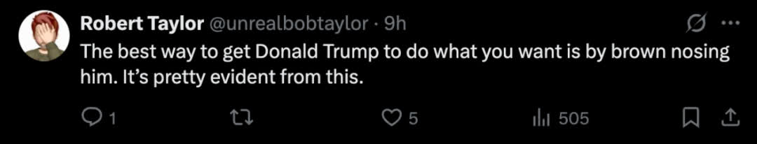 還有網友認為,「讓唐納德·特朗普按你的意願行事的最好辦法就是拍他馬屁。從這件事上就能明顯看出這一點」。